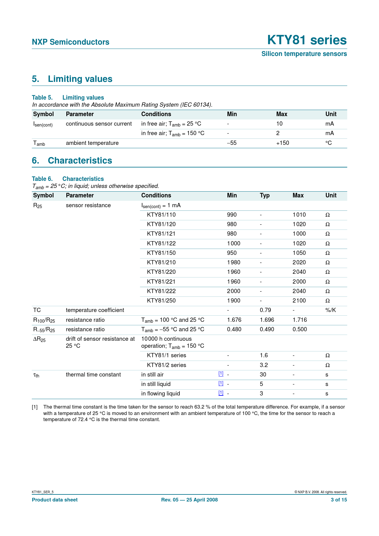 R25 sensor resistance Isen(cont) = 1 mA KTY81/110 990 - 1010 Ω KTY81/120 980 - 1020 Ω KTY81/121 980 - 1000 Ω KTY81/122 1000 - 1020 Ω KTY81/150 950 - 1050 Ω KTY81/210 1980 - 2020 Ω KTY81/220 1960 - 2040 Ω KTY81/221 1960 - 2000 Ω KTY81/222 2000 - 2040 Ω KTY81/250 1900 - 2100 Ω TC temperature coefficient - 0.79 - %/K R100/R25 resistance ratio Tamb = 100 °C and 25 °C 1.676 1.696 1.716 R−55/R25 resistance ratio Tamb = −55 °C and 25 °C 0.480 0.490 0.500 ∆R25 drift of sensor resistance at 10000 h continuous 25 °C operation; Tamb = 150 °C KTY81/1 series - 1.6 - Ω KTY81/2 series - 3.2 - Ω τth thermal time constant in still air [1] - 30 - s in still liquid [1] - 5 - s in flowing liquid [1] - 3 - s [1] The thermal time constant is the time taken for the sensor to reach 63.2 % of the total temperature difference. For example, if a sensor with a temperature of 25 °C is moved to an environment with an ambient temperature of 100 °C, the time for the sensor to reach a temperature of 72.4 °C is the thermal time constant. KTY81_SER_5 © NXP B.V. 2008. All rights reserved.