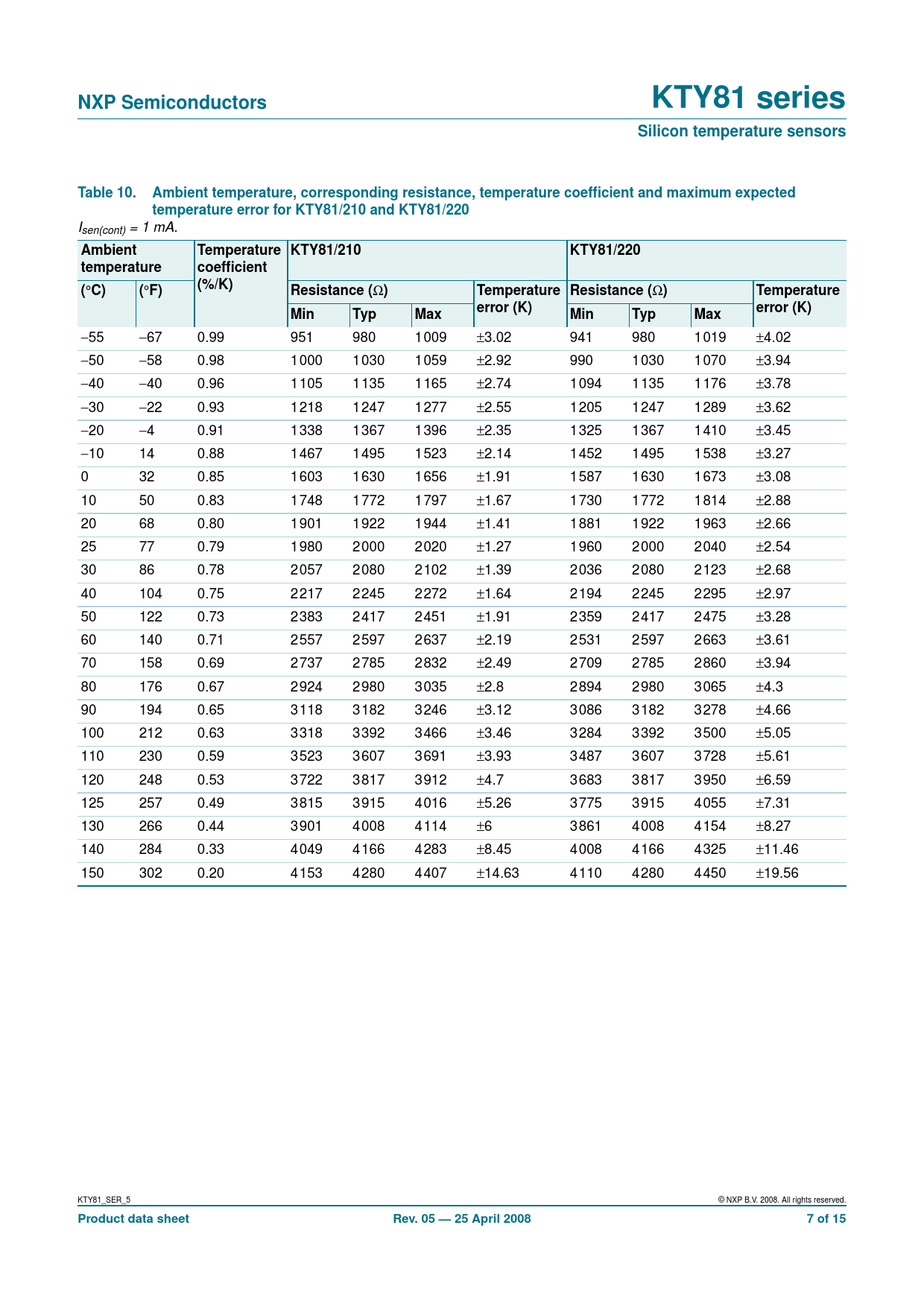 NXP Semiconductors. KTY81 series. Silicon temperature sensors. Table 10