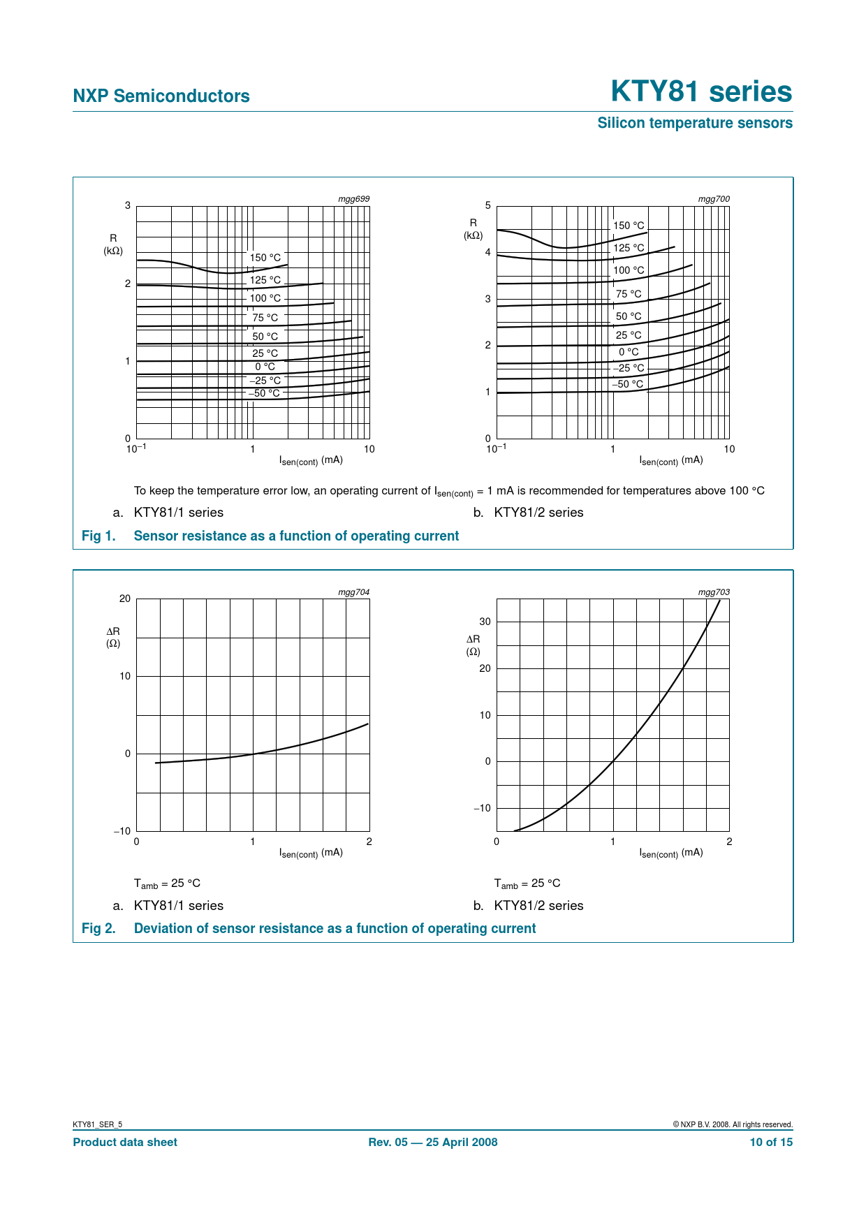 NXP Semiconductors. KTY81 series. Silicon temperature sensors. Fig 1. Sensor resistance as a function of operating current. Fig 2