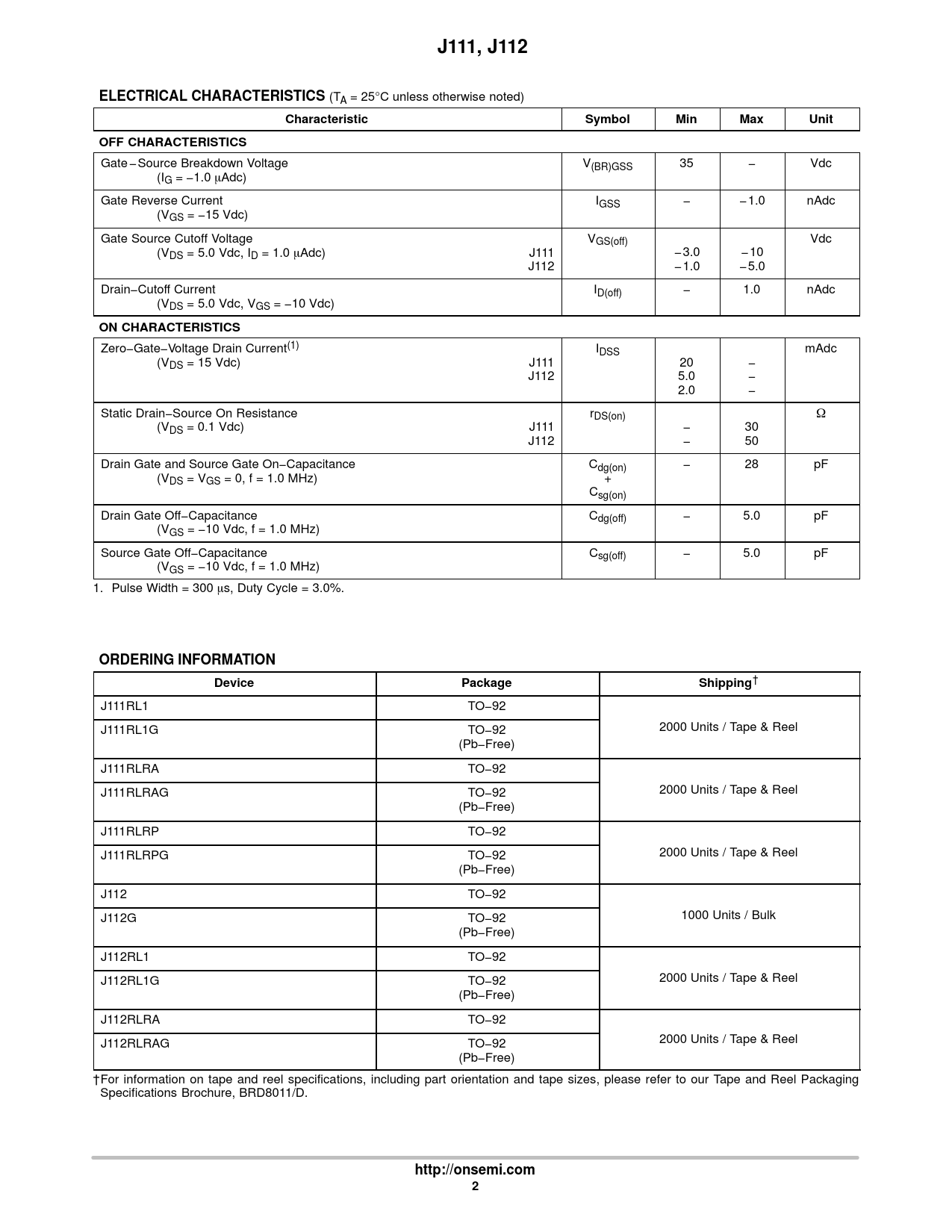 J111, J112. ELECTRICAL CHARACTERISTICS. Characteristic. Symbol. Min. Max. Unit. OFF CHARACTERISTICS. ON CHARACTERISTICS