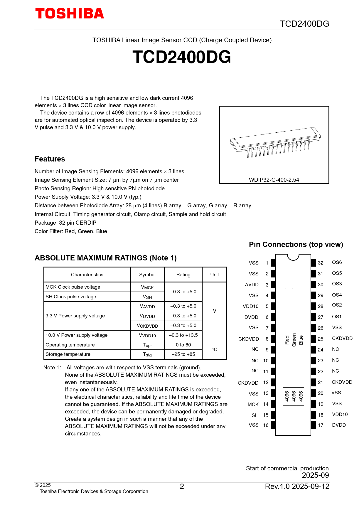 TCD2400DG. Features. Pin Connections (top view). ABSOLUTE MAXIMUM RATINGS (Note 1)