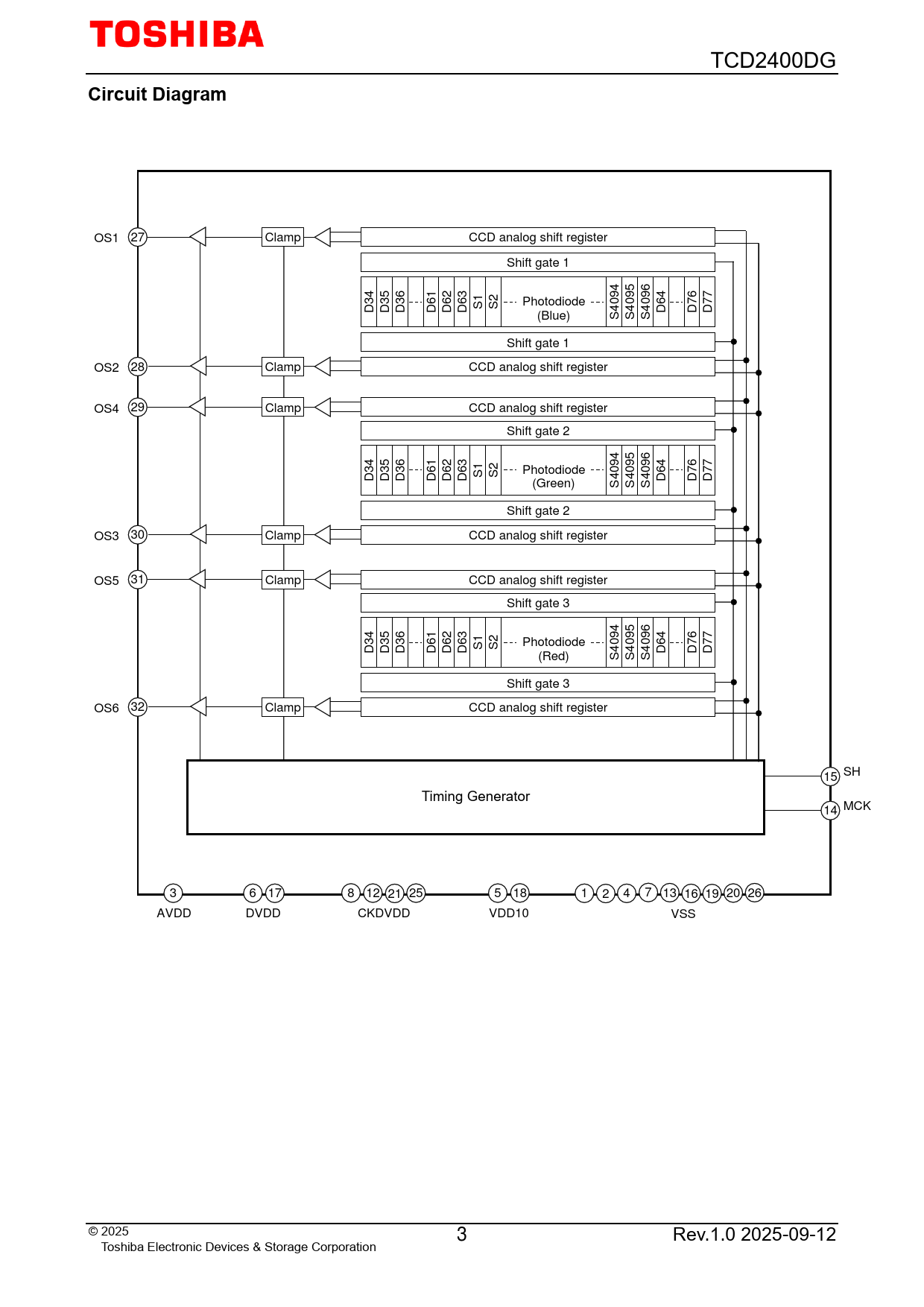 OS1 27 Clamp CCD analog shift register Shift gate 1 4 5 6 4 5 6 2 3 9 9 9 4 6 7 3 3 3 61 6 6 Photodiode 0 0 0 6 7 7 D D D D D D S1 S2 4 4 4 D D D (Blue) S S S Shift gate 1 OS2 28 Clamp CCD analog shift register OS4 29 Clamp CCD analog shift register Shift gate 2 4 5 6 4 5 6 2 3 9 9 9 4 6 7 3 3 3 61 6 6 Photodiode 0 0 0 6 7 7 D D D D D D S1 S2 4 4 4 D D D (Green) S S S Shift gate 2 OS3 30 Clamp CCD analog shift register OS5 31 Clamp CCD analog shift register Shift gate 3 4 5 6 4 5 6 2 3 9 9 9 4 6 7 3 3 3 61 6 6 Photodiode 0 0 0 6 7 7 D D D D D D S1 S2 4 4 4 D D D (Red) S S S Shift gate 3 OS6 32 Clamp CCD analog shift register 15 SH Timing Generator 14 MCK 3 6 17 8 12 21 25 5 18 1 2 4 7 13 16 19 20 26 AVDD DVDD CKDVDD VDD10 VSS © 2025 3 Rev.1.0 2025-09-12 Toshiba Electronic Devices & Storage Corporation