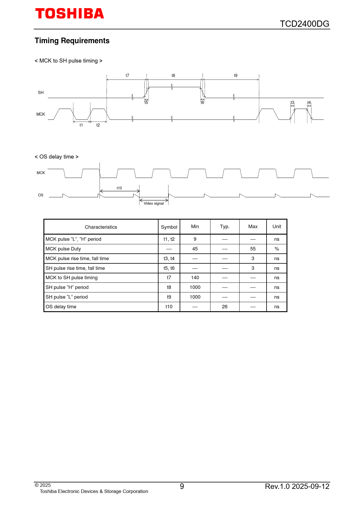 < MCK to SH pulse timing > t7 t8 t9 SH t5 t6 t3 t4 MCK t1 t2 < OS delay time > MCK t10 OS Video signal Characteristics Symbol Min Typ. Max Unit MCK pulse “L”, “H” period t1, t2 9 ⎯ ⎯ ns MCK pulse Duty ⎯ 45 ⎯ 55 % MCK pulse rise time, fall time t3, t4 ⎯ ⎯ 3 ns SH pulse rise time, fall time t5, t6 ⎯ ⎯ 3 ns MCK to SH pulse timing t7 140 ⎯ ⎯ ns SH pulse “H” period t8 1000 ⎯ ⎯ ns SH pulse “L” period t9 1000 ⎯ ⎯ ns OS delay time t10 ⎯ 26 ⎯ ns © 2025 9 Rev.1.0 2025-09-12 Toshiba Electronic Devices & Storage Corporation
