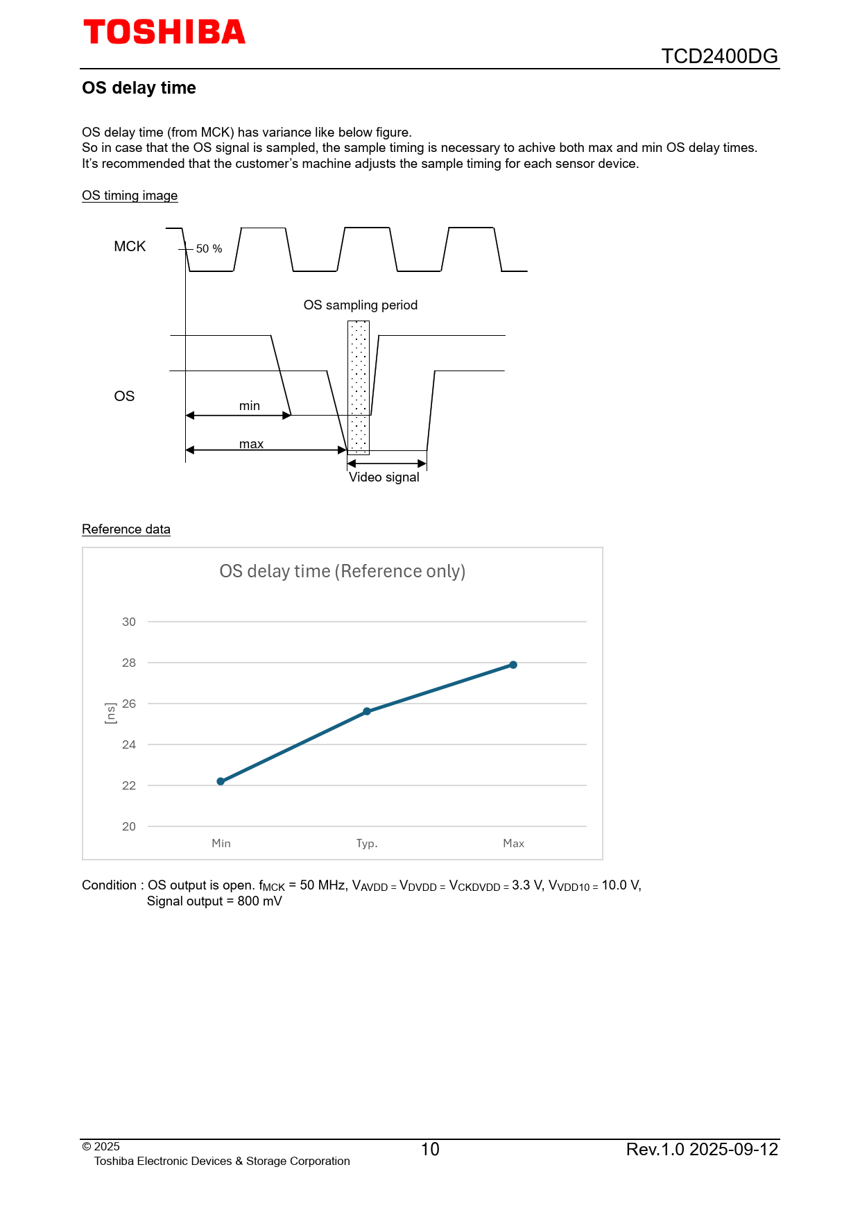 OS delay time (from MCK) has variance like below figure. So in case that the OS signal is sampled, the sample timing is necessary to achive both max and min OS delay times. It’s recommended that the customer’s machine adjusts the sample timing for each sensor device. OS timing image MCK 50 % OS sampling period OS min max Video signal Reference data Condition : OS output is open. fMCK = 50 MHz, VAVDD = VDVDD = VCKDVDD = 3.3 V, VVDD10 = 10.0 V, Signal output = 800 mV © 2025 10 Rev.1.0 2025-09-12 Toshiba Electronic Devices & Storage Corporation