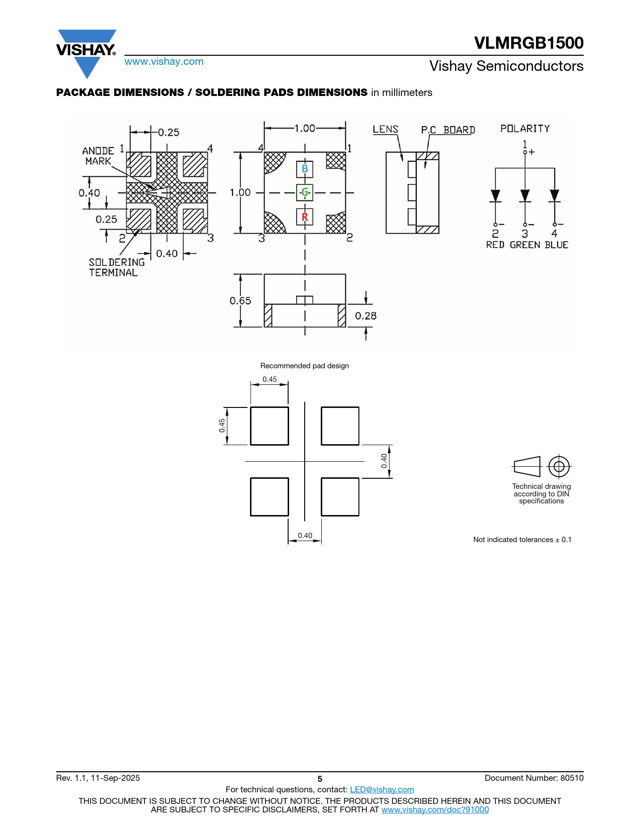 VLMRGB1500 www.vishay.com Vishay Semiconductors PACKAGE DIMENSIONS / SOLDERING PADS DIMENSIONS in millimeters Recommended pad design 0.45 0.45 0.40 Technical drawing according to DIN specifications 0.40 Not indicated tolerances ± 0.1 Rev. 1.1, 11-Sep-2025 5 Document Number: 80510 For technical questions, contact: LED@vishay.com THIS DOCUMENT IS SUBJECT TO CHANGE WITHOUT NOTICE. THE PRODUCTS DESCRIBED HEREIN AND THIS DOCUMENT ARE SUBJECT TO SPECIFIC DISCLAIMERS, SET FORTH AT www.vishay.com/doc?91000