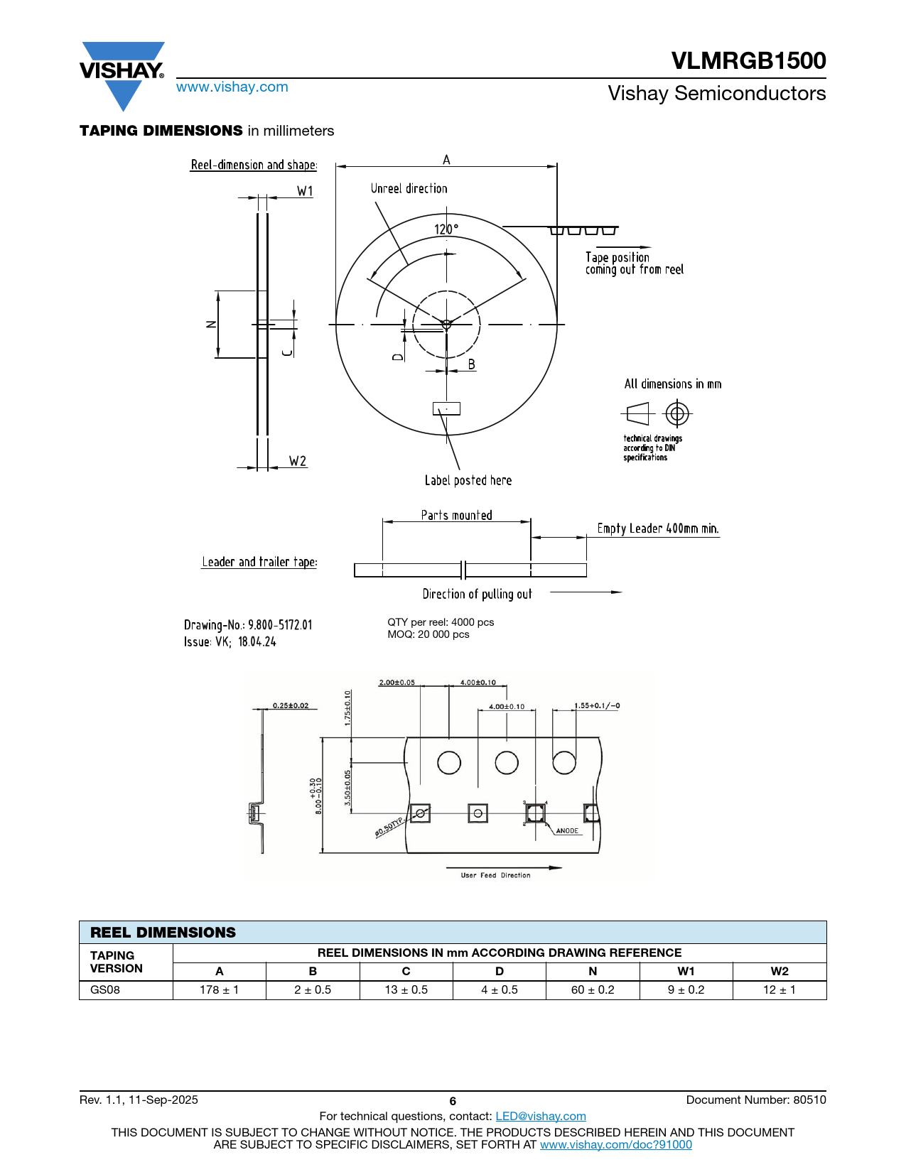 VLMRGB1500 www.vishay.com Vishay Semiconductors TAPING DIMENSIONS in millimeters QTY per reel: 4000 pcs MOQ: 20 000 pcs REEL DIMENSIONS TAPINGREEL DIMENSIONS IN mm ACCORDING DRAWING REFERENCEVERSIONABCDNW1W2 GS08 178 ± 1 2 ± 0.5 13 ± 0.5 4 ± 0.5 60 ± 0.2 9 ± 0.2 12 ± 1 Rev. 1.1, 11-Sep-2025 6 Document Number: 80510 For technical questions, contact: LED@vishay.com THIS DOCUMENT IS SUBJECT TO CHANGE WITHOUT NOTICE. THE PRODUCTS DESCRIBED HEREIN AND THIS DOCUMENT ARE SUBJECT TO SPECIFIC DISCLAIMERS, SET FORTH AT www.vishay.com/doc?91000