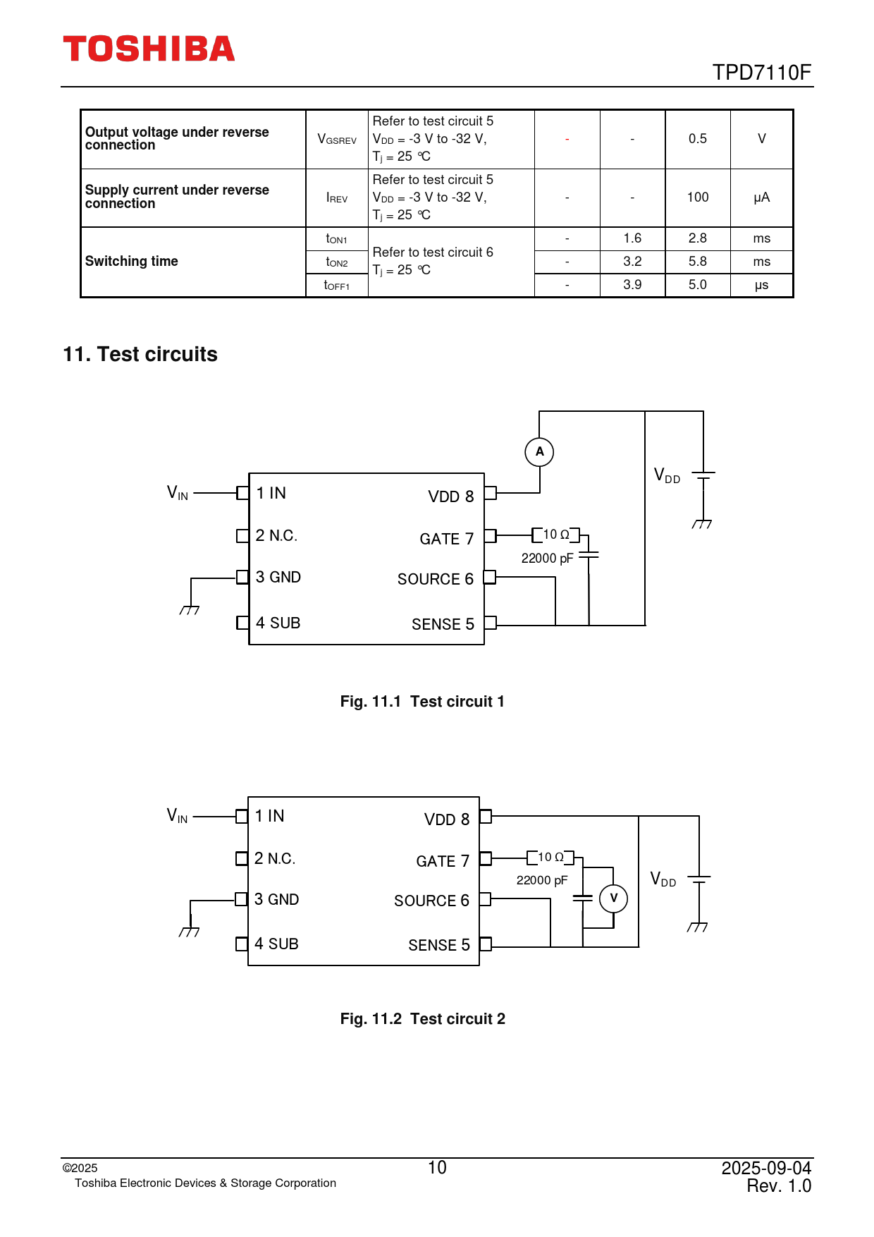 Output voltage under reverse. connection. Supply current under reverse. Switching time. 11. Test circuits