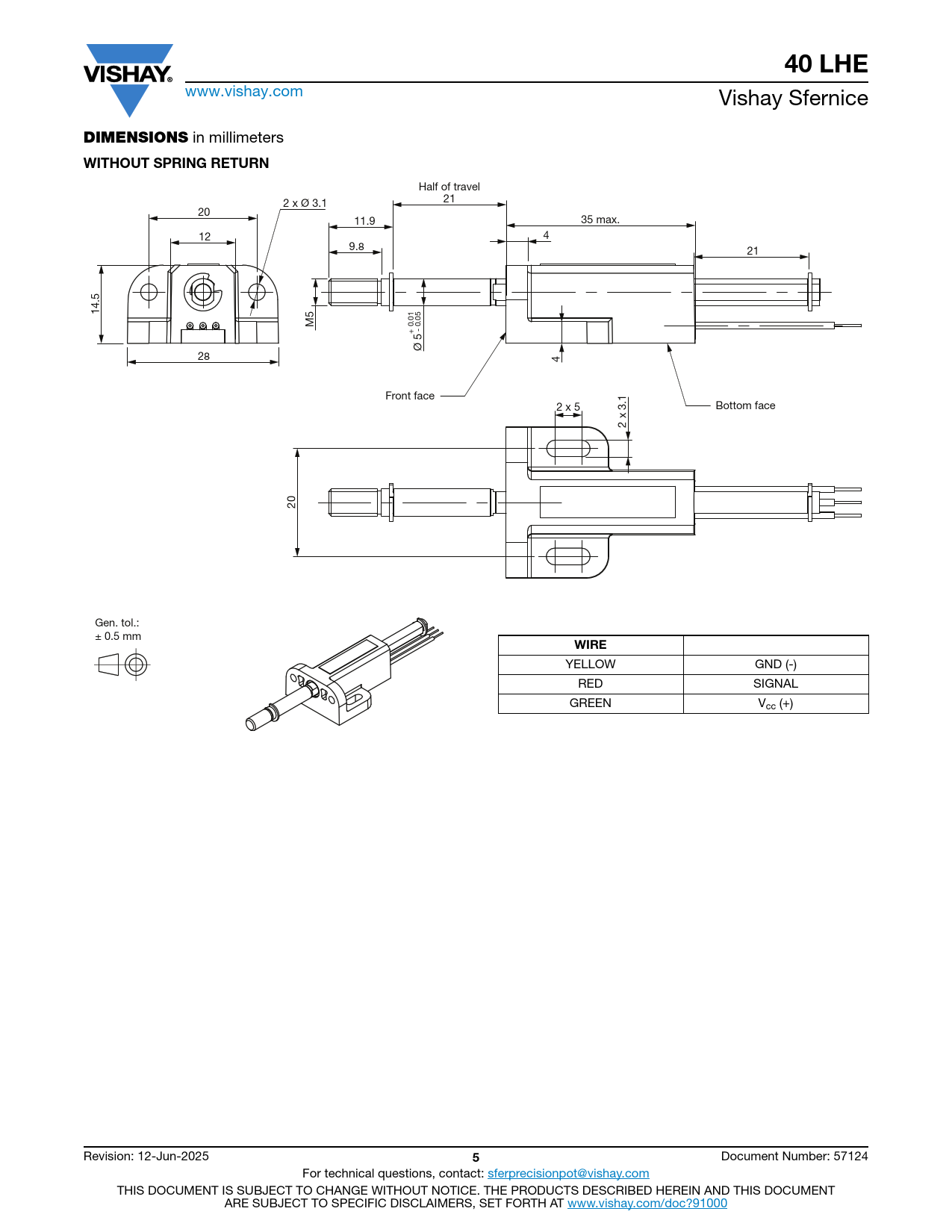 40 LHE www.vishay.com Vishay Sfernice DIMENSIONS in millimeters WITHOUT SPRING RETURN Half of travel 21 2 x Ø 3.1 20 11.9 35 max. 12 4 9.8 21 14.5 M5 + 0.01 - 0.05 Ø 5 28 4 Front face 2 x 5 Bottom face 2 x 3.1 20 Gen. tol.: ± 0.5 mm WIRE YELLOW GND (-) RED SIGNAL GREEN Vcc (+) Revision: 12-Jun-2025 5 Document Number: 57124 For technical questions, contact: sferprecisionpot@vishay.com THIS DOCUMENT IS SUBJECT TO CHANGE WITHOUT NOTICE. THE PRODUCTS DESCRIBED HEREIN AND THIS DOCUMENT ARE SUBJECT TO SPECIFIC DISCLAIMERS, SET FORTH AT www.vishay.com/doc?91000