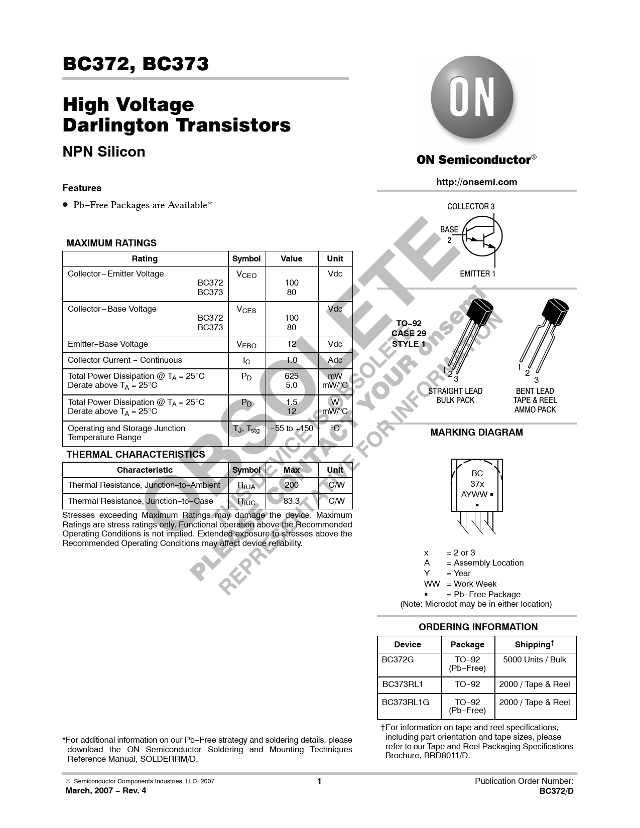 Collector−Emitter Voltage VCEO Vdc EMITTER 1 BC372 100 BC373 80 Collector−Base Voltage VCES Vdc BC372 100 BC373 80