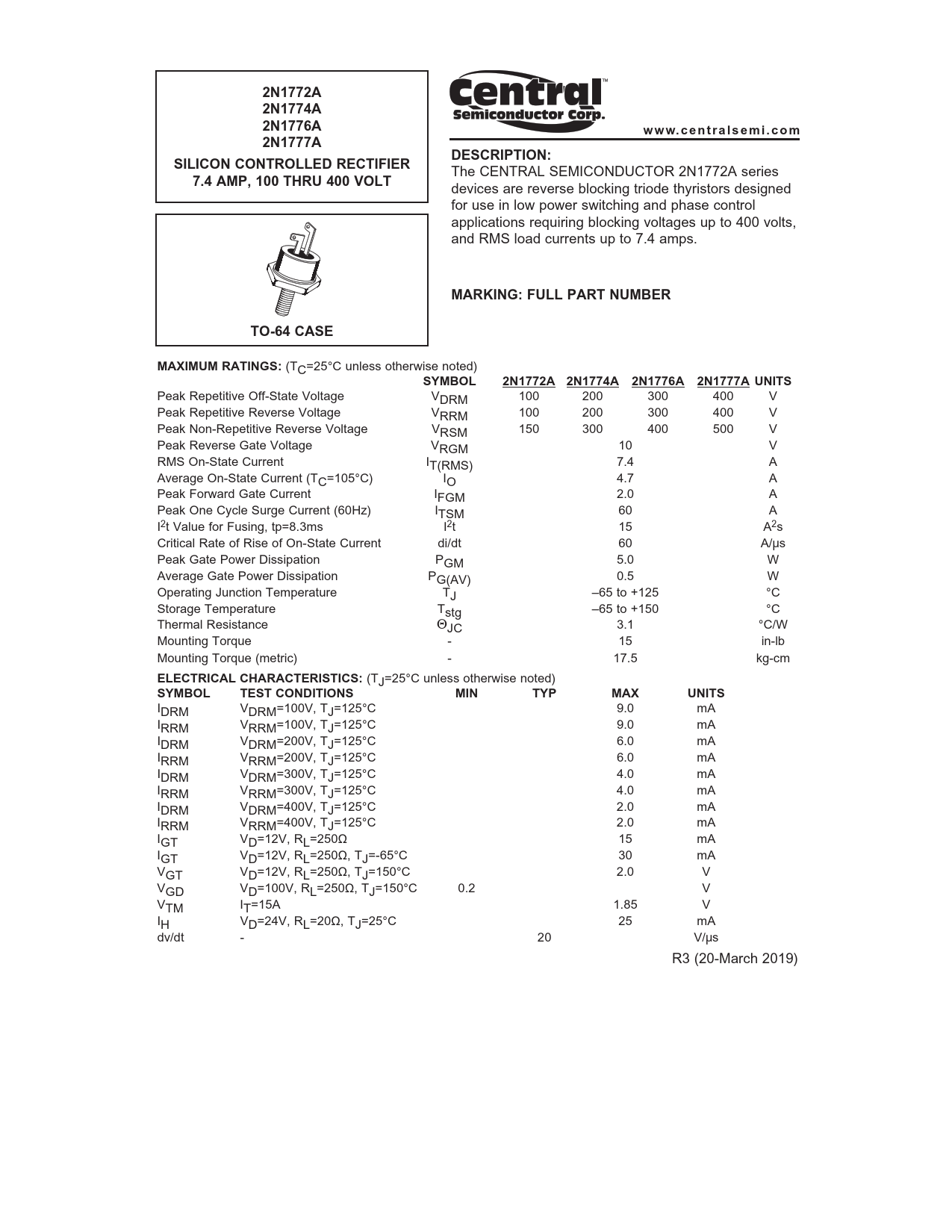 2N1772A2N1774A2N1776Awww.centra lsemi.com2N1777ADESCRIPTION:SILICON CONTROLLED RECTIFIER7.4 AMP, 100 THRU 400 VOLT The CENTRAL SEMICONDUCTOR 2N1772A series devices are reverse blocking triode thyristors designed for use in low power switching and phase control applications requiring blocking voltages up to 400 volts, and RMS load currents up to 7.4 amps. MARKING: FULL PART NUMBERTO-64 CASEMAXIMUM RATINGS: (TC=25°C unless otherwise noted) SYMBOL2N1772A2N1774A2N1776A2N1777AUNITS Peak Repetitive Off-State Voltage VDRM 100 200 300 400 V Peak Repetitive Reverse Voltage VRRM 100 200 300 400 V Peak Non-Repetitive Reverse Voltage VRSM 150 300 400 500 V Peak Reverse Gate Voltage VRGM 10 V RMS On-State Current IT(RMS) 7.4 A Average On-State Current (TC=105°C) IO 4.7 A Peak Forward Gate Current IFGM 2.0 A Peak One Cycle Surge Current (60Hz) ITSM 60 A I2t Value for Fusing, tp=8.3ms I2t 15 A2s Critical Rate of Rise of On-State Current di/dt 60 A/μs Peak Gate Power Dissipation PGM 5.0 W Average Gate Power Dissipation PG(AV) 0.5 W Operating Junction Temperature TJ –65 to +125 °C Storage Temperature Tstg –65 to +150 °C Thermal Resistance JC 3.1 °C/W Mounting Torque - 15 in-lb Mounting Torque (metric) - 17.5 kg-cm ELECTRICAL CHARACTERISTICS: (TJ=25°C unless otherwise noted) SYMBOL TESTCONDITIONSMINTYPMAXUNITS IDRM VDRM=100V, TJ=125°C 9.0 mA IRRM VRRM=100V, TJ=125°C 9.0 mA IDRM VDRM=200V, TJ=125°C 6.0 mA IRRM VRRM=200V, TJ=125°C 6.0 mA IDRM VDRM=300V, TJ=125°C 4.0 mA IRRM VRRM=300V, TJ=125°C 4.0 mA IDRM VDRM=400V, TJ=125°C 2.0 mA IRRM VRRM=400V, TJ=125°C 2.0 mA IGT VD=12V, RL=250Ω 15 mA IGT VD=12V, RL=250Ω, TJ=-65°C 30 mA VGT VD=12V, RL=250Ω, TJ=150°C 2.0 V VGD VD=100V, RL=250Ω, TJ=150°C 0.2 V VTM IT=15A 1.85 V IH VD=24V, RL=20Ω, TJ=25°C 25 mA dv/dt - 20 V/μs R3 (20-March 2019)