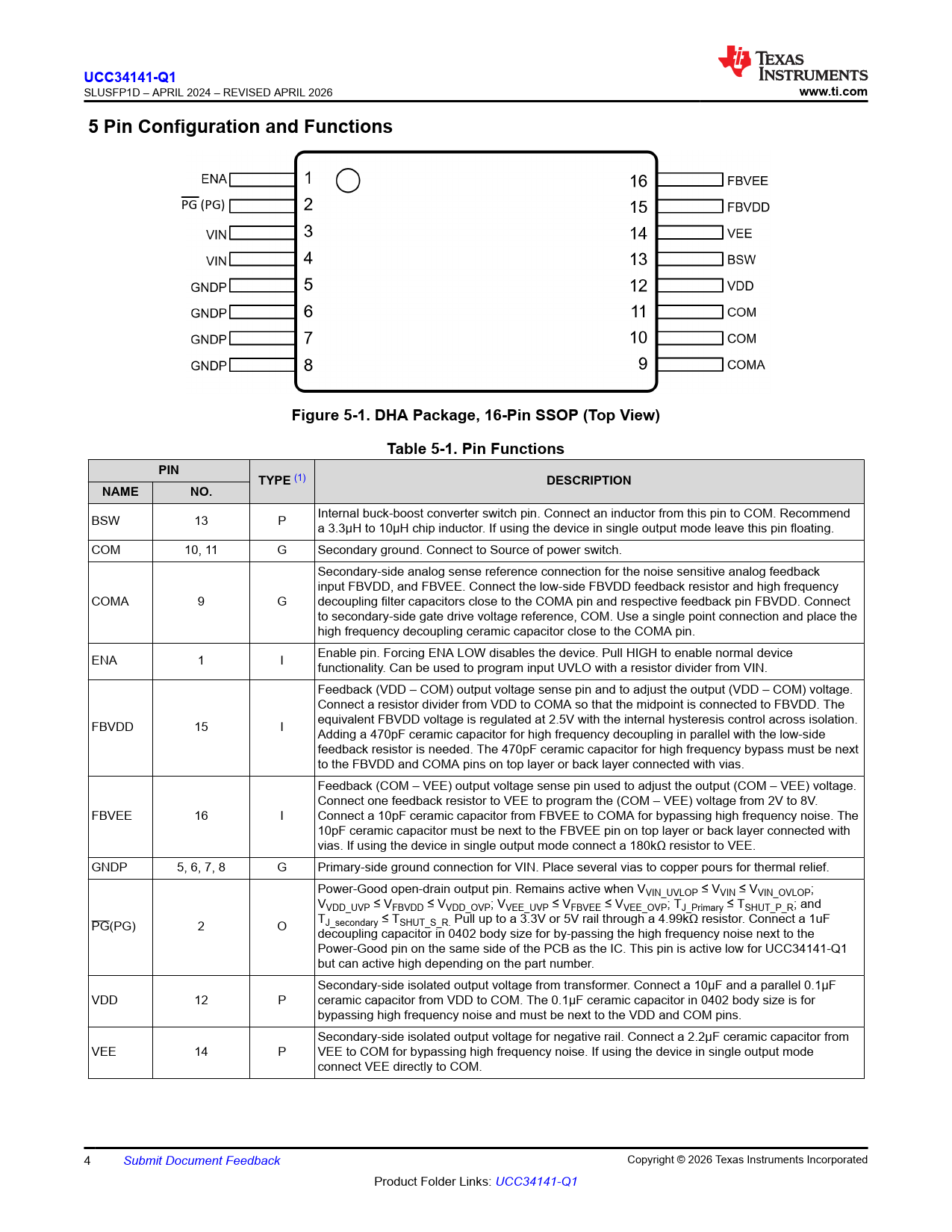 Internal buck-boost converter switch pin. Connect an inductor from this pin to COM. Recommend BSW 13 P a 3.3µH to 10µH chip inductor. If using the device in single output mode leave this pin floating. COM 10, 11 G Secondary ground. Connect to Source of power switch. Secondary-side analog sense reference connection for the noise sensitive analog feedback input FBVDD, and FBVEE. Connect the low-side FBVDD feedback resistor and high frequency COMA 9 G decoupling filter capacitors close to the COMA pin and respective feedback pin FBVDD. Connect to secondary-side gate drive voltage reference, COM. Use a single point connection and place the high frequency decoupling ceramic capacitor close to the COMA pin. Enable pin. Forcing ENA LOW disables the device. Pull HIGH to enable normal device ENA 1 I functionality. Can be used to program input UVLO with a resistor divider from VIN. Feedback (VDD – COM) output voltage sense pin and to adjust the output (VDD – COM) voltage. Connect a resistor divider from VDD to COMA so that the midpoint is connected to FBVDD. The equivalent FBVDD voltage is regulated at 2.5V with the internal hysteresis control across isolation. FBVDD 15 I Adding a 470pF ceramic capacitor for high frequency decoupling in parallel with the low-side feedback resistor is needed. The 470pF ceramic capacitor for high frequency bypass must be next to the FBVDD and COMA pins on top layer or back layer connected with vias. Feedback (COM – VEE) output voltage sense pin used to adjust the output (COM – VEE) voltage. Connect one feedback resistor to VEE to program the (COM – VEE) voltage from 2V to 8V. FBVEE 16 I Connect a 10pF ceramic capacitor from FBVEE to COMA for bypassing high frequency noise. The 10pF ceramic capacitor must be next to the FBVEE pin on top layer or back layer connected with vias. If using the device in single output mode connect a 180kΩ resistor to VEE. GNDP 5, 6, 7, 8 G Primary-side ground connection for VIN. Place several vias to copper pours for thermal relief. Power-Good open-drain output pin. Remains active when VVIN_UVLOP ≤ VVIN ≤ VVIN_OVLOP; VVDD_UVP ≤ VFBVDD ≤ VVDD_OVP; VVEE_UVP ≤ VFBVEE ≤ VVEE_OVP; TJ_Primary ≤ TSHUT_P_R; and T PG(PG) 2 O J_secondary ≤ TSHUT_S_R. Pull up to a 3.3V or 5V rail through a 4.99kΩ resistor. Connect a 1uF decoupling capacitor in 0402 body size for by-passing the high frequency noise next to the Power-Good pin on the same side of the PCB as the IC. This pin is active low for UCC34141-Q1 but can active high depending on the part number. Secondary-side isolated output voltage from transformer. Connect a 10µF and a parallel 0.1µF VDD 12 P ceramic capacitor from VDD to COM. The 0.1µF ceramic capacitor in 0402 body size is for bypassing high frequency noise and must be next to the VDD and COM pins. Secondary-side isolated output voltage for negative rail. Connect a 2.2µF ceramic capacitor from VEE 14 P VEE to COM for bypassing high frequency noise. If using the device in single output mode connect VEE directly to COM. 4 Submit Document Feedback Copyright © 2026 Texas Instruments Incorporated Product Folder Links: UCC34141-Q1 Document Outline 1 Features 2 Applications 3 Description Table of Contents 4 Device Comparison 5 Pin Configuration and Functions 6 Specifications 6.1 Absolute Maximum Ratings 6.2 ESD Ratings 6.3 Recommended Operating Conditions 6.4 Thermal Information 6.5 Insulation Specifications 6.6 Electrical Characteristics 6.7 Safety Limiting Values 6.8 Typical Characteristics 7 Detailed Description 7.1 Overview 7.2 Functional Block Diagram 7.3 Feature Description 7.3.1 Power Stage Operation 7.3.1.1 VDD-COM Voltage Regulation 7.3.1.2 COM-VEE Voltage Regulation 7.3.1.3 COM-VEE Output Capability 7.3.2 Output Voltage Soft Start 7.3.3 ENA and Power-Good 7.3.4 Protection Functions 7.3.4.1 Input Undervoltage Lockout 7.3.4.2 Input Overvoltage Lockout 7.3.4.3 Output Undervoltage Protection 7.3.4.4 Output Overvoltage Protection 7.3.4.5 Output Short Circuit Protection 7.3.4.6 Over-Temperature Protection 7.3.4.7 BSW Pin Faults Protection 7.4 Device Functional Modes 8 Application and Implementation 8.1 Application Information 8.2 Typical Application 8.2.1 Design Requirements 8.2.2 Detailed Design Procedure 8.2.2.1 VDD-COM Voltage Regulation 8.2.2.2 COM-VEE Voltage Regulation and Single Output Configuration 8.3 System Examples 8.4 Power Supply Recommendations 8.5 Layout 8.5.1 Layout Guidelines 8.5.2 Layout Example 9 Device and Documentation Support 9.1 Third-Party Products Disclaimer 9.2 Documentation Support 9.2.1 Related Documentation 9.3 Receiving Notification of Documentation Updates 9.4 Support Resources 9.5 Trademarks 9.6 Electrostatic Discharge Caution 9.7 Glossary 10 Revision History 11 Mechanical, Packaging, and Orderable Information