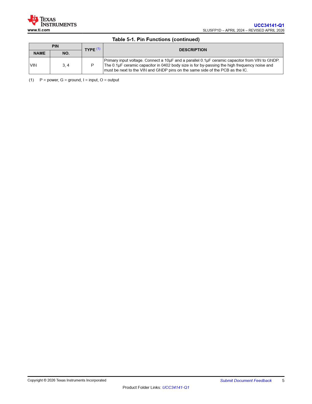 UCC34141-Q1. www.ti.com. Table 5-1. Pin Functions (continued). PIN. TYPE. DESCRIPTION. NAME. NO