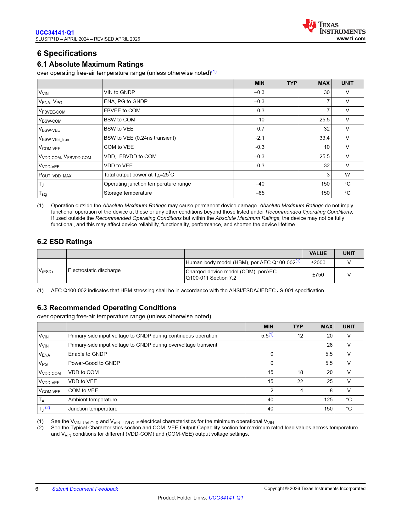 VVIN Primary-side input voltage to GNDP during continuous operation 5.5(1) 12 20 V VVIN Primary-side input voltage to GNDP during overvoltage transient 28 V VENA Enable to GNDP 0 5.5 V VPG Power-Good to GNDP 0 5.5 V VVDD-COM VDD to COM 15 18 20 V VVDD-VEE VDD to VEE 15 22 25 V VCOM-VEE COM to VEE 2 4 8 V TA Ambient temperature –40 125 °C TJ (2) Junction temperature –40 150 °C (1) See the VVIN_UVLO_R and VVIN_ UVLO_F electrical characteristics for the minimum operational VVIN. (2) See the Typical Characteristics section and COM_VEE Output Capability section for maximum rated load values across temperature and VVIN conditions for different (VDD-COM) and (COM-VEE) output voltage settings. 6 Submit Document Feedback Copyright © 2026 Texas Instruments Incorporated Product Folder Links: UCC34141-Q1 Document Outline 1 Features 2 Applications 3 Description Table of Contents 4 Device Comparison 5 Pin Configuration and Functions 6 Specifications 6.1 Absolute Maximum Ratings 6.2 ESD Ratings 6.3 Recommended Operating Conditions 6.4 Thermal Information 6.5 Insulation Specifications 6.6 Electrical Characteristics 6.7 Safety Limiting Values 6.8 Typical Characteristics 7 Detailed Description 7.1 Overview 7.2 Functional Block Diagram 7.3 Feature Description 7.3.1 Power Stage Operation 7.3.1.1 VDD-COM Voltage Regulation 7.3.1.2 COM-VEE Voltage Regulation 7.3.1.3 COM-VEE Output Capability 7.3.2 Output Voltage Soft Start 7.3.3 ENA and Power-Good 7.3.4 Protection Functions 7.3.4.1 Input Undervoltage Lockout 7.3.4.2 Input Overvoltage Lockout 7.3.4.3 Output Undervoltage Protection 7.3.4.4 Output Overvoltage Protection 7.3.4.5 Output Short Circuit Protection 7.3.4.6 Over-Temperature Protection 7.3.4.7 BSW Pin Faults Protection 7.4 Device Functional Modes 8 Application and Implementation 8.1 Application Information 8.2 Typical Application 8.2.1 Design Requirements 8.2.2 Detailed Design Procedure 8.2.2.1 VDD-COM Voltage Regulation 8.2.2.2 COM-VEE Voltage Regulation and Single Output Configuration 8.3 System Examples 8.4 Power Supply Recommendations 8.5 Layout 8.5.1 Layout Guidelines 8.5.2 Layout Example 9 Device and Documentation Support 9.1 Third-Party Products Disclaimer 9.2 Documentation Support 9.2.1 Related Documentation 9.3 Receiving Notification of Documentation Updates 9.4 Support Resources 9.5 Trademarks 9.6 Electrostatic Discharge Caution 9.7 Glossary 10 Revision History 11 Mechanical, Packaging, and Orderable Information