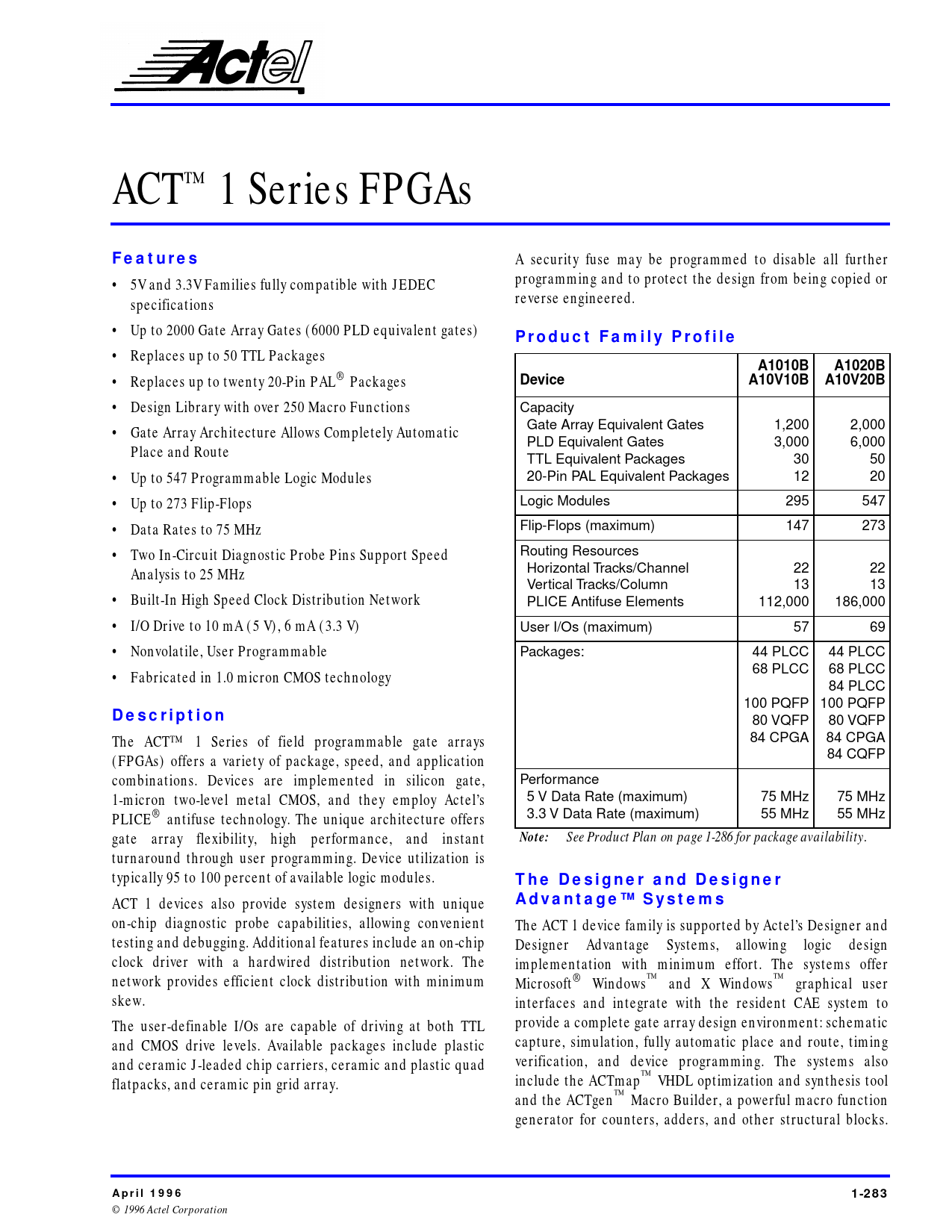 © 1996 Actel Corporation Document Outline ACT™ 1 Series FPGAs Features Description Product Family Profile The Designer and Designer Advantage™ Systems ACT 1 Device Structure The ACT 1 Logic Module I/O Buffers Device Organization Probe Pin ACT 1 Array Performance Temperature and Voltage Effects Logic Module Size Ordering Information Product Plan Device Resources Pin Description Absolute Maximum Ratings1 Free air temperature range Recommended Operating Conditions Electrical Specifications (5V) Electrical Specifications (3.3V) Package Thermal Characteristics General Power Equation Static Power Component Active Power Component Equivalent Capacitance CEQ Values for Actel FPGAs Fixed Capacitance Values for Actel FPGAs (pF) Determining Average Switching Frequency Functional Timing Tests Output Buffer Performance Derating (5V) Output Buffer Performance Derating (3.3V) ACT 1 Timing Module* Predictable Performance: Tight Delay Distributions... Timing Characteristics Critical Nets and Typical Nets Long Tracks Timing Derating Timing Derating Factor (Temperature and Voltage) Timing Derating Factor for Designs at Typical Temp... Temperature and Voltage Derating Factors (normaliz... Temperature and Voltage Derating Factors (normaliz... Junction Temperature and Voltage Derating Curves (... Parameter Measurement Output Buffer Delays AC Test Loads Input Buffer Delays Module Delays Sequential Timing Characteristics Flip-Flops and Latches ACT 1 Timing Characteristics (Worst-Case Commercial Conditions, VCC = 4.75 V,T... ACT 1 Timing Characteristics (continued) (Worst-Case Commercial Conditions) ACT 1 Timing Characteristics (continued) (Worst-Case Commercial Conditions) Package Pin Assignments 44-Pin PLCC 68-Pin PLCC Package Pin Assignments (continued) 84-Pin PLCC Package Pin Assignments (continued) 100-Pin PQFP Package Pin Assignments (continued) 80-Pin VQFP Package Pin Assignments (continued) 84-Pin CPGA Package Pin Assignments (continued) 84-Pin CQFP