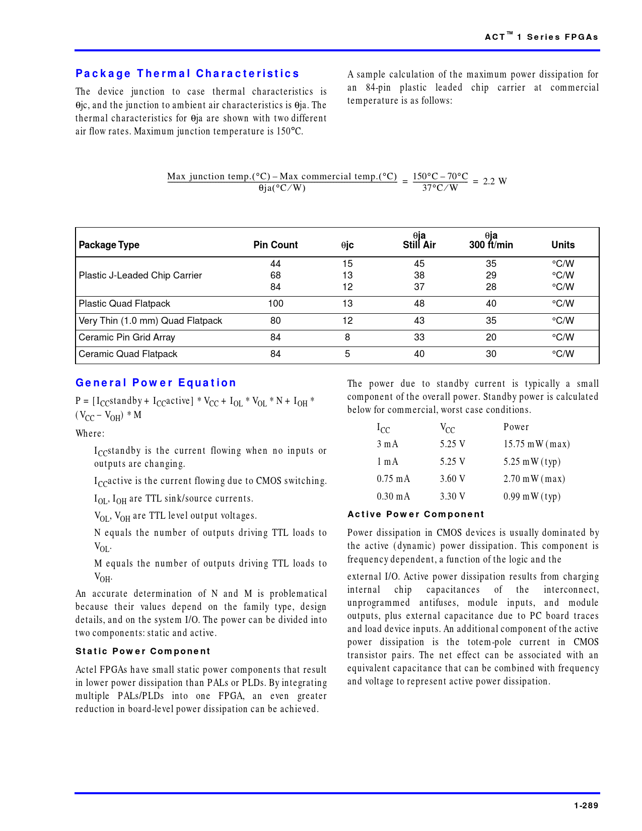 A C T ™ 1 S e r i e s F P G A sP a c k a g e T h e r m a l C h a r a c t e r i s t i c s A sample calculation of the maximum power dissipation for The device junction to case thermal characteristics is an 84-pin plastic leaded chip carrier at commercial θjc, and the junction to ambient air characteristics is θja. The temperature is as follows: thermal characteristics for θja are shown with two different air flow rates. Maximum junction temperature is 150°C. Max junction te m p.(°C) – Max commercial te m p . ( ° C ) 150°C – 70°C -----------------------------θ--------------------------------------------- = ------------------ = 2.2 W ja(°C ⁄ W) 37°C ⁄ W θ ja θ jaPackage TypePin Count θ jcStill Air300 ft/minUnits 44 15 45 35 °C/W Plastic J-Leaded Chip Carrier 68 13 38 29 °C/W 84 12 37 28 °C/W Plastic Quad Flatpack 100 13 48 40 °C/W Very Thin (1.0 mm) Quad Flatpack 80 12 43 35 °C/W Ceramic Pin Grid Array 84 8 33 20 °C/W Ceramic Quad Flatpack 84 5 40 30 °C/W G e n e r a l P o w e r E q u a t i o n The power due to standby current is typically a small P = [I component of the overall power. Standby power is calculated CCstandby + ICCactive] * VCC + IOL * VOL * N + IOH * below for commercial, worst case conditions. (VCC – VOH) * M I Where: CC VCC Power 3 mA 5.25 V 15.75 mW (max) ICCstandby is the current flowing when no inputs or outputs are changing. 1 mA 5.25 V 5.25 mW (typ) I 0.75 mA 3.60 V 2.70 mW (max) CCactive is the current flowing due to CMOS switching. I 0.30 mA 3.30 V 0.99 mW (typ) OL, IOH are TTL sink/source currents. V Active Power Component OL, VOH are TTL level output voltages. N equals the number of outputs driving TTL loads to Power dissipation in CMOS devices is usually dominated by VOL. the active (dynamic) power dissipation. This component is M equals the number of outputs driving TTL loads to frequency dependent, a function of the logic and the VOH. external I/O. Active power dissipation results from charging An accurate determination of N and M is problematical internal chip capacitances of the interconnect, because their values depend on the family type, design unprogrammed antifuses, module inputs, and module details, and on the system I/O. The power can be divided into outputs, plus external capacitance due to PC board traces two components: static and active. and load device inputs. An additional component of the active power dissipation is the totem-pole current in CMOS Static Power Component transistor pairs. The net effect can be associated with an Actel FPGAs have small static power components that result equivalent capacitance that can be combined with frequency in lower power dissipation than PALs or PLDs. By integrating and voltage to represent active power dissipation. multiple PALs/PLDs into one FPGA, an even greater reduction in board-level power dissipation can be achieved. 1-289 Document Outline ACT™ 1 Series FPGAs Features Description Product Family Profile The Designer and Designer Advantage™ Systems ACT 1 Device Structure The ACT 1 Logic Module I/O Buffers Device Organization Probe Pin ACT 1 Array Performance Temperature and Voltage Effects Logic Module Size Ordering Information Product Plan Device Resources Pin Description Absolute Maximum Ratings1 Free air temperature range Recommended Operating Conditions Electrical Specifications (5V) Electrical Specifications (3.3V) Package Thermal Characteristics General Power Equation Static Power Component Active Power Component Equivalent Capacitance CEQ Values for Actel FPGAs Fixed Capacitance Values for Actel FPGAs (pF) Determining Average Switching Frequency Functional Timing Tests Output Buffer Performance Derating (5V) Output Buffer Performance Derating (3.3V) ACT 1 Timing Module* Predictable Performance: Tight Delay Distributions... Timing Characteristics Critical Nets and Typical Nets Long Tracks Timing Derating Timing Derating Factor (Temperature and Voltage) Timing Derating Factor for Designs at Typical Temp... Temperature and Voltage Derating Factors (normaliz... Temperature and Voltage Derating Factors (normaliz... Junction Temperature and Voltage Derating Curves (... Parameter Measurement Output Buffer Delays AC Test Loads Input Buffer Delays Module Delays Sequential Timing Characteristics Flip-Flops and Latches ACT 1 Timing Characteristics (Worst-Case Commercial Conditions, VCC = 4.75 V,T... ACT 1 Timing Characteristics (continued) (Worst-Case Commercial Conditions) ACT 1 Timing Characteristics (continued) (Worst-Case Commercial Conditions) Package Pin Assignments 44-Pin PLCC 68-Pin PLCC Package Pin Assignments (continued) 84-Pin PLCC Package Pin Assignments (continued) 100-Pin PQFP Package Pin Assignments (continued) 80-Pin VQFP Package Pin Assignments (continued) 84-Pin CPGA Package Pin Assignments (continued) 84-Pin CQFP