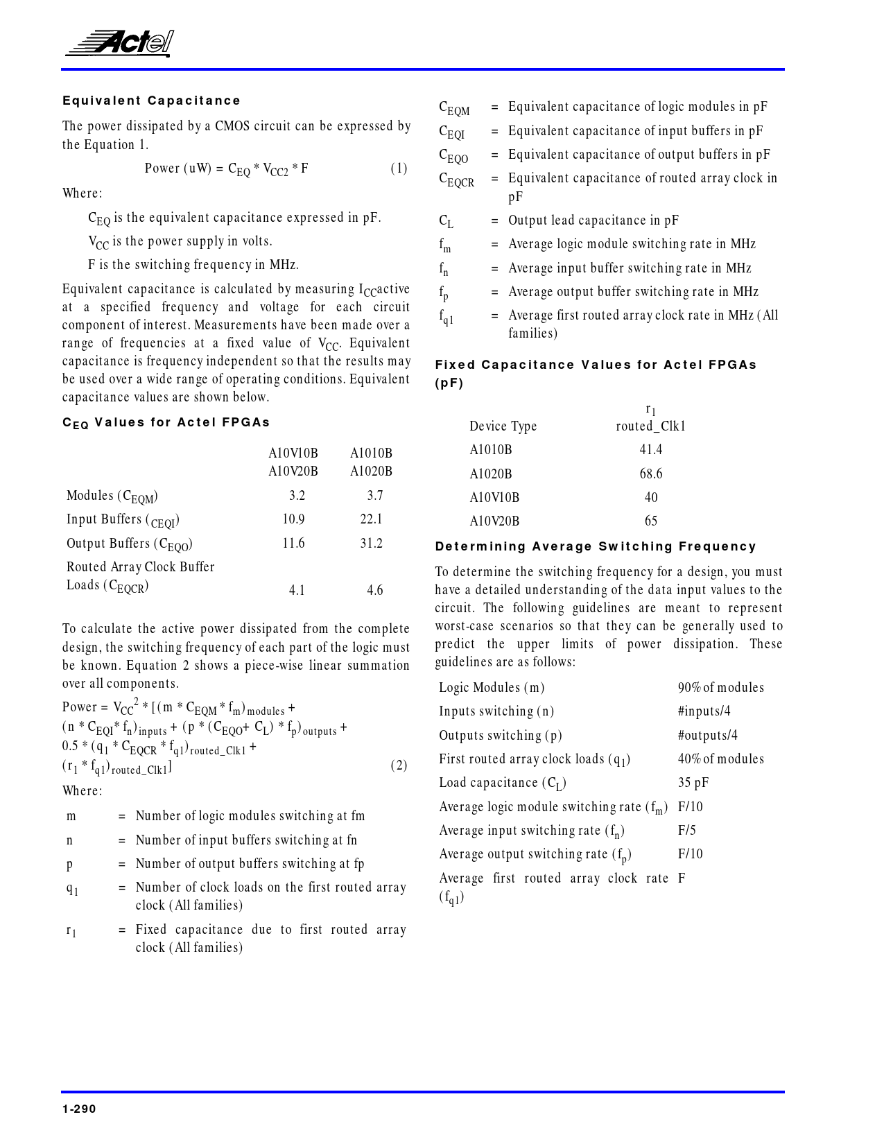 Equivalent Capacitance. Fixed Capacitance Values for Actel FPGAs. (pF). CEQ Values for Actel FPGAs