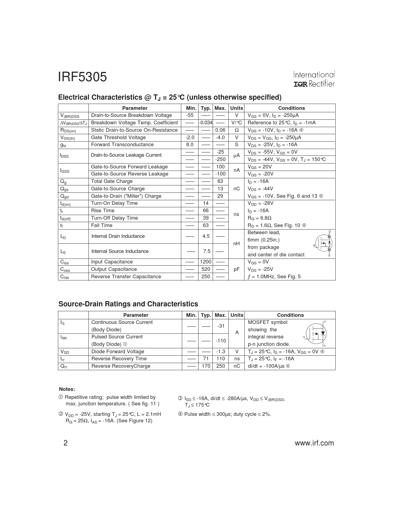 Repetitive rating; pulse width limited by ISD ≤ -16A, di/dt ≤ -280A/µs, VDD ≤ V(BR)DSS, max. junction temperature. ( See fig. 11 ) T ≤ J 175°C V DD = -25V, starting TJ = 25°C, L = 2.1mH Pulse width ≤ 300µs; duty cycle ≤ 2%. RG = 25Ω, IAS = -16A. (See Figure 12) 2 www.irf.com