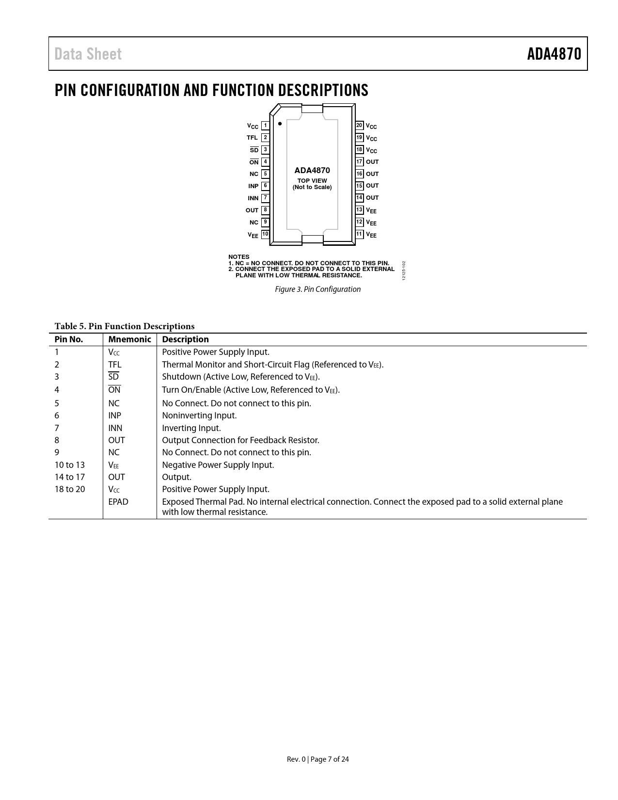 Data SheetADA4870PIN CONFIGURATION AND FUNCTION DESCRIPTIONSV120CCVCCTFL219 VCCSD 318 VCC4ON17 OUTADA4870NC516 OUTTOP VIEWINP 615(Not to Scale)OUTINN714 OUTOUT813 VEENC912 VEEV1011EEVEENOTES 1. NC = NO CONNECT. DO NOT CONNECT TO THIS PIN. 2 2. CONNECT THE EXPOSED PAD TO A SOLID EXTERNAL -10 PLANE WITH LOW THERMAL RESISTANCE. 12125 Figure 3. Pin Configuration Table 5. Pin Function Descriptions Pin No.Mnemonic Description 1 VCC Positive Power Supply Input. 2 TFL Thermal Monitor and Short-Circuit Flag (Referenced to VEE). 3 SD Shutdown (Active Low, Referenced to VEE). 4 ON Turn On/Enable (Active Low, Referenced to VEE). 5 NC No Connect. Do not connect to this pin. 6 INP Noninverting Input. 7 INN Inverting Input. 8 OUT Output Connection for Feedback Resistor. 9 NC No Connect. Do not connect to this pin. 10 to 13 VEE Negative Power Supply Input. 14 to 17 OUT Output. 18 to 20 VCC Positive Power Supply Input. EPAD Exposed Thermal Pad. No internal electrical connection. Connect the exposed pad to a solid external plane with low thermal resistance. Rev. 0 | Page 7 of 24 Document Outline Features Applications Functional Block Diagram General Description Revision History Specifications ±20 V Supply ±5 V Supply Absolute Maximum Ratings Maximum Power Dissipation ESD Caution Pin Configuration and Function Descriptions Typical Performance Characteristics Applications Information , Initial Power-Up, and Short-Circuit Thermal Protection Shutdown () Feedback Resistor Selection Capacitive Load Driving Heat and Thermal Management Power Dissipation Safe Operating Area Printed Circuit Board (PCB) Thermal Modeling Heat Sink Selection Power Supplies and Decoupling Composite Amplifier Outline Dimensions Ordering Guide