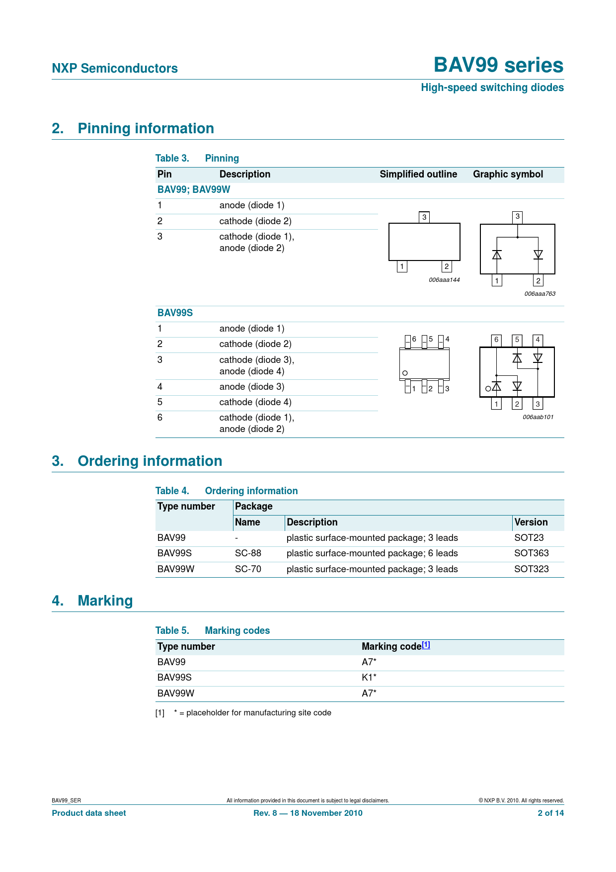 NXP Semiconductors. BAV99 series. High-speed switching diodes. 2. Pinning. information. Table 3. Pinning. Pin. Description