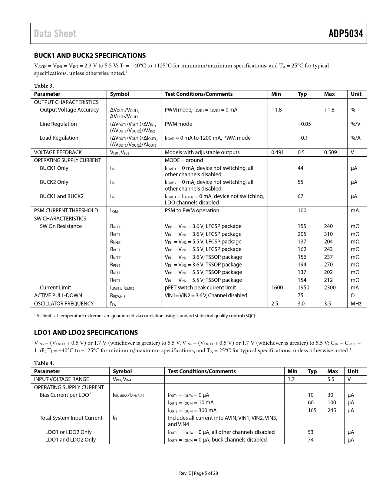 | 页数 / 页 | 28 / 5 — Data Sheet. ADP5034. BUCK1 AND BUCK2 SPECIFICATIONS. Table 3. Parameter. … |