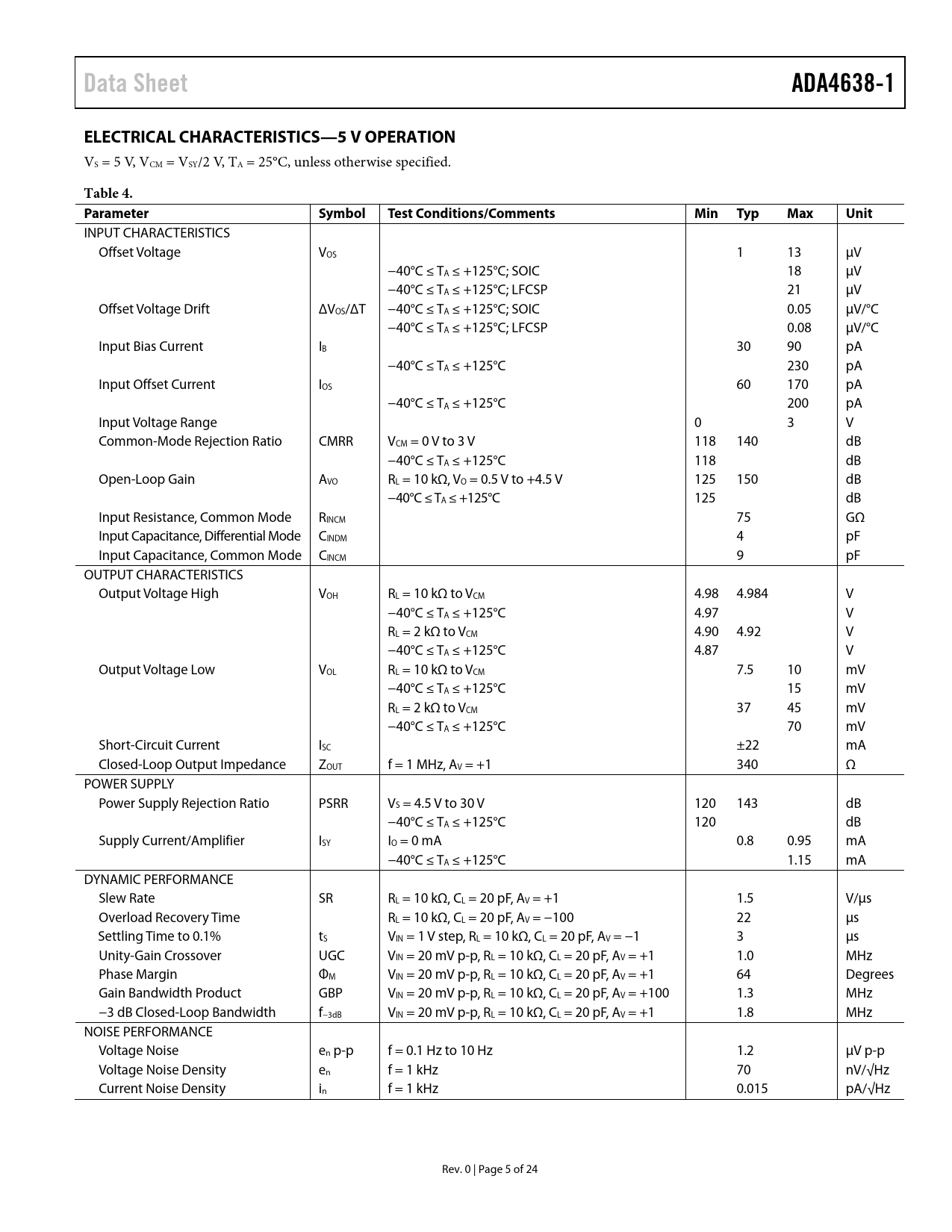 Data SheetADA4638-1ELECTRICAL CHARACTERISTICS—5 V OPERATION VS = 5 V, VCM = VSY/2 V, TA = 25°C, unless otherwise specified. Table 4. Parameter SymbolTestConditions/CommentsMinTypMaxUnit INPUT CHARACTERISTICS Offset Voltage VOS 1 13 μV −40°C ≤ TA ≤ +125°C; SOIC 18 μV −40°C ≤ TA ≤ +125°C; LFCSP 21 μV Offset Voltage Drift ΔVOS/ΔT −40°C ≤ TA ≤ +125°C; SOIC 0.05 μV/°C −40°C ≤ TA ≤ +125°C; LFCSP 0.08 μV/°C Input Bias Current IB 30 90 pA −40°C ≤ TA ≤ +125°C 230 pA Input Offset Current IOS 60 170 pA −40°C ≤ TA ≤ +125°C 200 pA Input Voltage Range 0 3 V Common-Mode Rejection Ratio CMRR VCM = 0 V to 3 V 118 140 dB −40°C ≤ TA ≤ +125°C 118 dB Open-Loop Gain AVO RL = 10 kΩ, VO = 0.5 V to +4.5 V 125 150 dB −40°C ≤ TA ≤ +125°C 125 dB Input Resistance, Common Mode RINCM 75 GΩ Input Capacitance, Differential Mode CINDM 4 pF Input Capacitance, Common Mode CINCM 9 pF OUTPUT CHARACTERISTICS Output Voltage High VOH RL = 10 kΩ to VCM 4.98 4.984 V −40°C ≤ TA ≤ +125°C 4.97 V RL = 2 kΩ to VCM 4.90 4.92 V −40°C ≤ TA ≤ +125°C 4.87 V Output Voltage Low VOL RL = 10 kΩ to VCM 7.5 10 mV −40°C ≤ TA ≤ +125°C 15 mV RL = 2 kΩ to VCM 37 45 mV −40°C ≤ TA ≤ +125°C 70 mV Short-Circuit Current ISC ±22 mA Closed-Loop Output Impedance ZOUT f = 1 MHz, AV = +1 340 Ω POWER SUPPLY Power Supply Rejection Ratio PSRR VS = 4.5 V to 30 V 120 143 dB −40°C ≤ TA ≤ +125°C 120 dB Supply Current/Amplifier ISY IO = 0 mA 0.8 0.95 mA −40°C ≤ TA ≤ +125°C 1.15 mA DYNAMIC PERFORMANCE Slew Rate SR RL = 10 kΩ, CL = 20 pF, AV = +1 1.5 V/μs Overload Recovery Time RL = 10 kΩ, CL = 20 pF, AV = −100 22 μs Settling Time to 0.1% tS VIN = 1 V step, RL = 10 kΩ, CL = 20 pF, AV = −1 3 μs Unity-Gain Crossover UGC VIN = 20 mV p-p, RL = 10 kΩ, CL = 20 pF, AV = +1 1.0 MHz Phase Margin ΦM VIN = 20 mV p-p, RL = 10 kΩ, CL = 20 pF, AV = +1 64 Degrees Gain Bandwidth Product GBP VIN = 20 mV p-p, RL = 10 kΩ, CL = 20 pF, AV = +100 1.3 MHz −3 dB Closed-Loop Bandwidth f−3dB VIN = 20 mV p-p, RL = 10 kΩ, CL = 20 pF, AV = +1 1.8 MHz NOISE PERFORMANCE Voltage Noise en p-p f = 0.1 Hz to 10 Hz 1.2 μV p-p Voltage Noise Density en f = 1 kHz 70 nV/√Hz Current Noise Density in f = 1 kHz 0.015 pA/√Hz Rev. 0 | Page 5 of 24 Document Outline FEATURES APPLICATIONS GENERAL DESCRIPTION TABLE OF CONTENTS REVISION HISTORY SPECIFICATIONS ELECTRICAL CHARACTERISTICS—30 V OPERATION ELECTRICAL CHARACTERISTICS—10 V OPERATION ELECTRICAL CHARACTERISTICS—5 V OPERATION ABSOLUTE MAXIMUM RATINGS THERMAL RESISTANCE ESD CAUTION TYPICAL PERFORMANCE CHARACTERISTICS APPLICATIONS INFORMATION DIFFERENTIATION THEORY OF OPERATION INPUT PROTECTION NO OUTPUT PHASE REVERSAL NOISE CONSIDERATIONS 1/f Noise COMPARATOR OPERATION PRECISION LOW-SIDE CURRENT SHUNT SENSOR PRINTED CIRCUIT BOARD LAYOUT OUTLINE DIMENSIONS ORDERING GUIDE