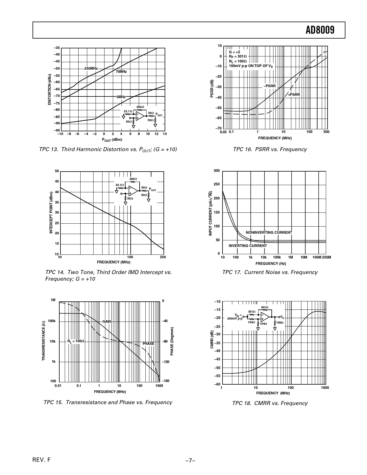TPC 13. Third Harmonic Distortion vs. POUT; (G = +10) TPC 16. PSRR vs. Frequency