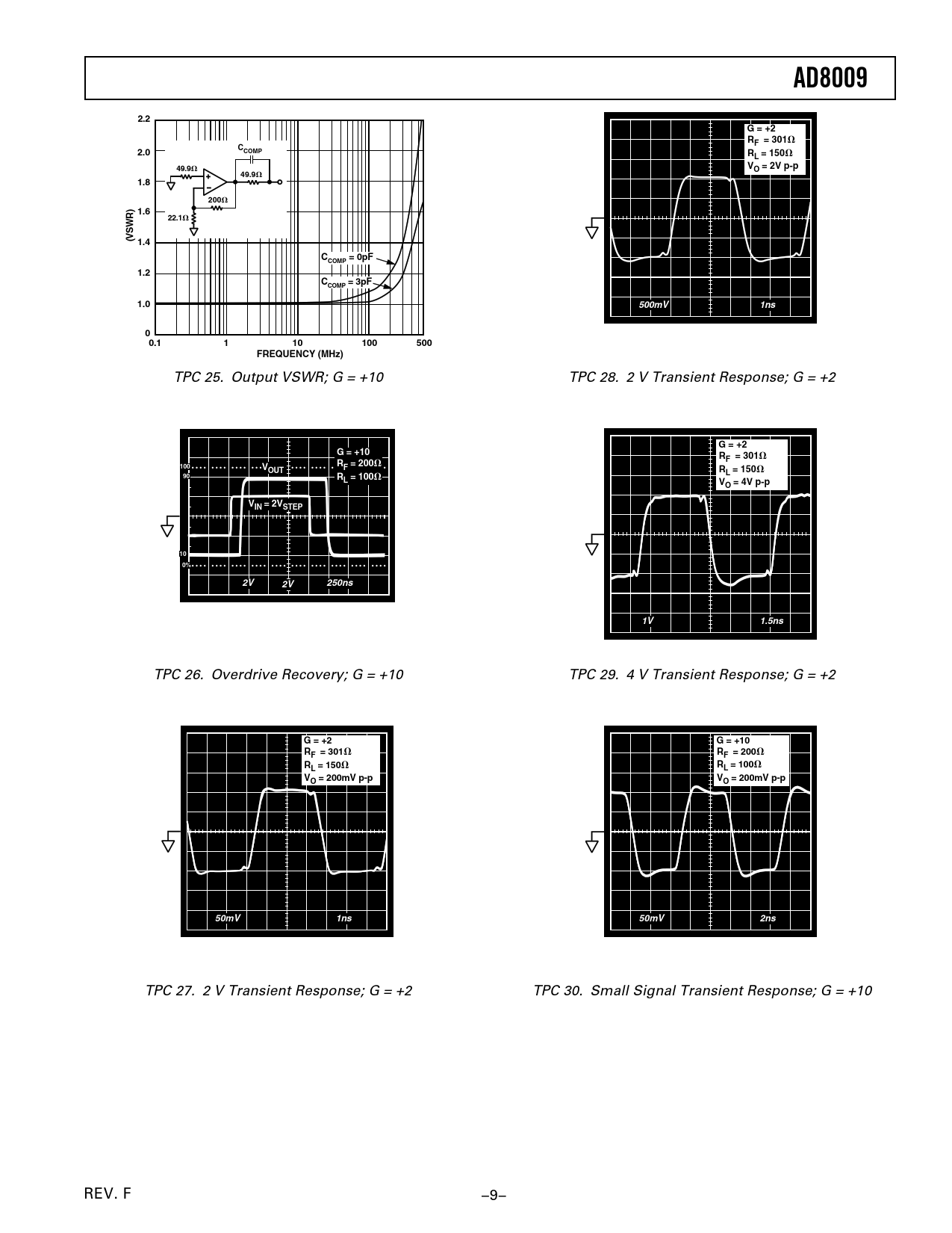 TPC 25. Output VSWR; G = +10 TPC 28. 2 V Transient Response; G = +2