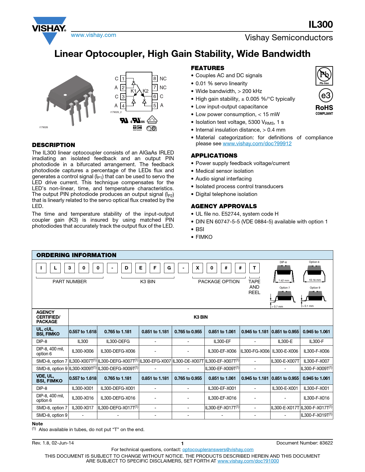 IL300. Linear Optocoupler, High Gain Stability, Wide Bandwidth. FEATURES. DESCRIPTION. APPLICATIONS. AGENCY APPROVALS