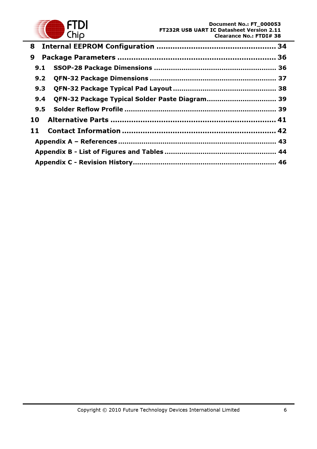 Document No.: FT_000053 FT232R USB UART IC Datasheet Version 2.11 Clearance No.: FTDI# 38 8 Internal EEPROM Configuration .. 34 9 Package Parameters ... 36 9.1 SSOP-28 Package Dimensions .. 36 9.2 QFN-32 Package Dimensions .. 37 9.3 QFN-32 Package Typical Pad Layout ... 38 9.4 QFN-32 Package Typical Solder Paste Diagram ... 39 9.5 Solder Reflow Profile .. 39 10 Alternative Parts .. 41 11 Contact Information ... 42 Appendix A – References ... 43 Appendix B - List of Figures and Tables ... 44 Appendix C - Revision History .. 46