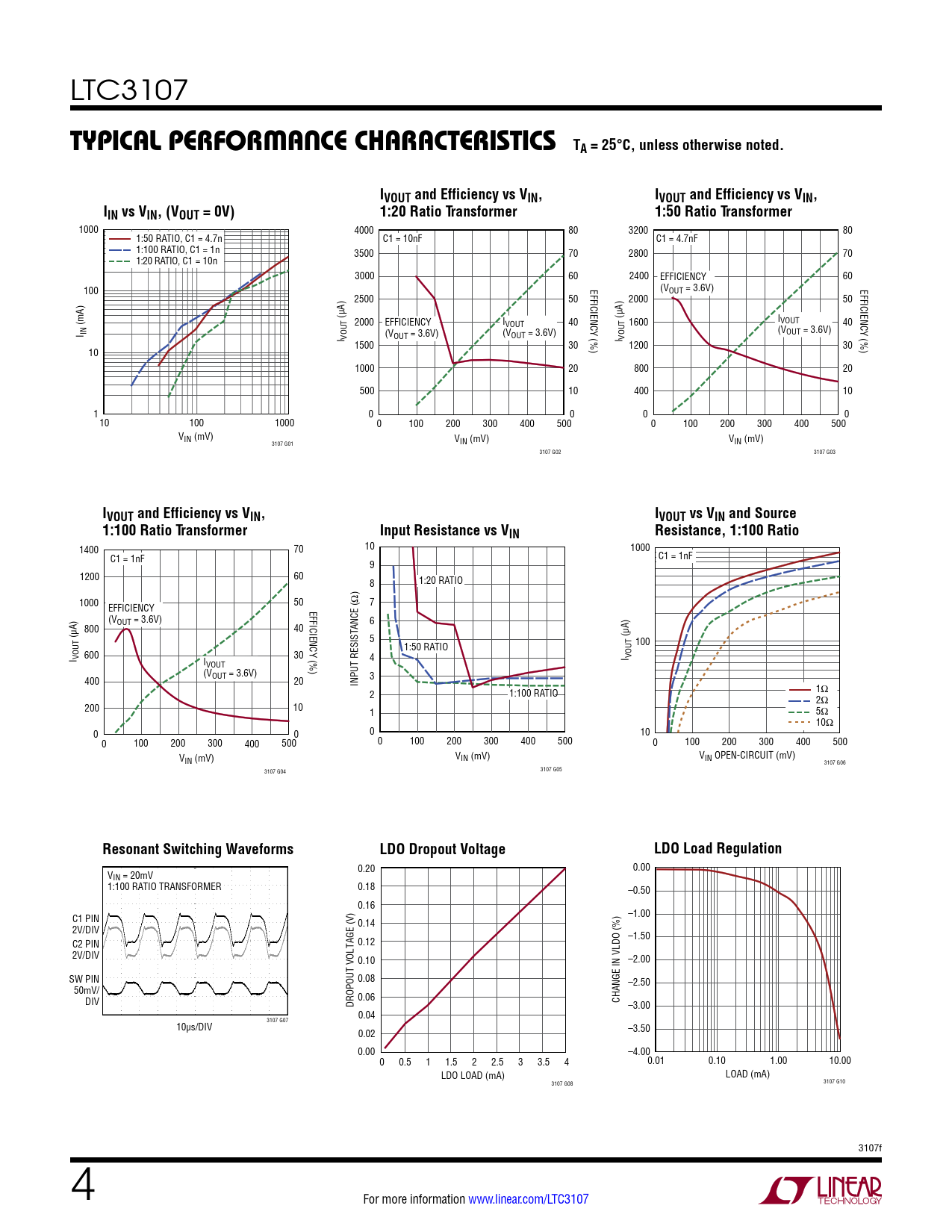 10 1400 70 1000 C1 = 1nF C1 = 1nF 9 1200 60 8 1:20 RATIO 1000 50 7 EFFICIENCY EFFICIENCY (%) (VOUT = 3.6V) 40 ANCE (Ω) 6 800 (µA) 5 (µA) 1:50 RATIO 100 I VOUT 600 30 4 I VOUT IVOUT (VOUT = 3.6V) 3 400 20 INPUT RESIST 2 1:100 RATIO 1Ω 2Ω 200 10 1 5Ω 10Ω 0 0 0 10 0 100 200 300 400 500 0 100 200 300 400 500 0 100 200 300 400 500 V V IN (mV) VIN OPEN-CIRCUIT (mV) IN (mV) 3107 G06 3107 G05 3107 G04