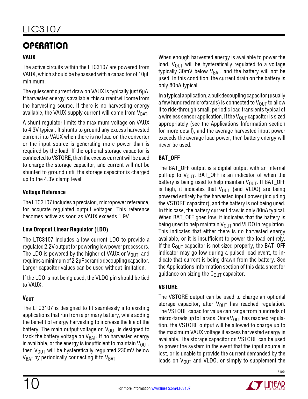 is high, it indicates that VOUT (and VLDO) are being powered entirely by the harvested input power (including The LTC3107 includes a precision, micropower reference, the VSTORE capacitor), and the battery is not being used. for accurate regulated output voltages. This reference In this case, the battery current draw is only 80nA typical. becomes active as soon as VAUX exceeds 1.9V. When BAT_OFF goes low, it indicates that the battery is being used to help maintain V