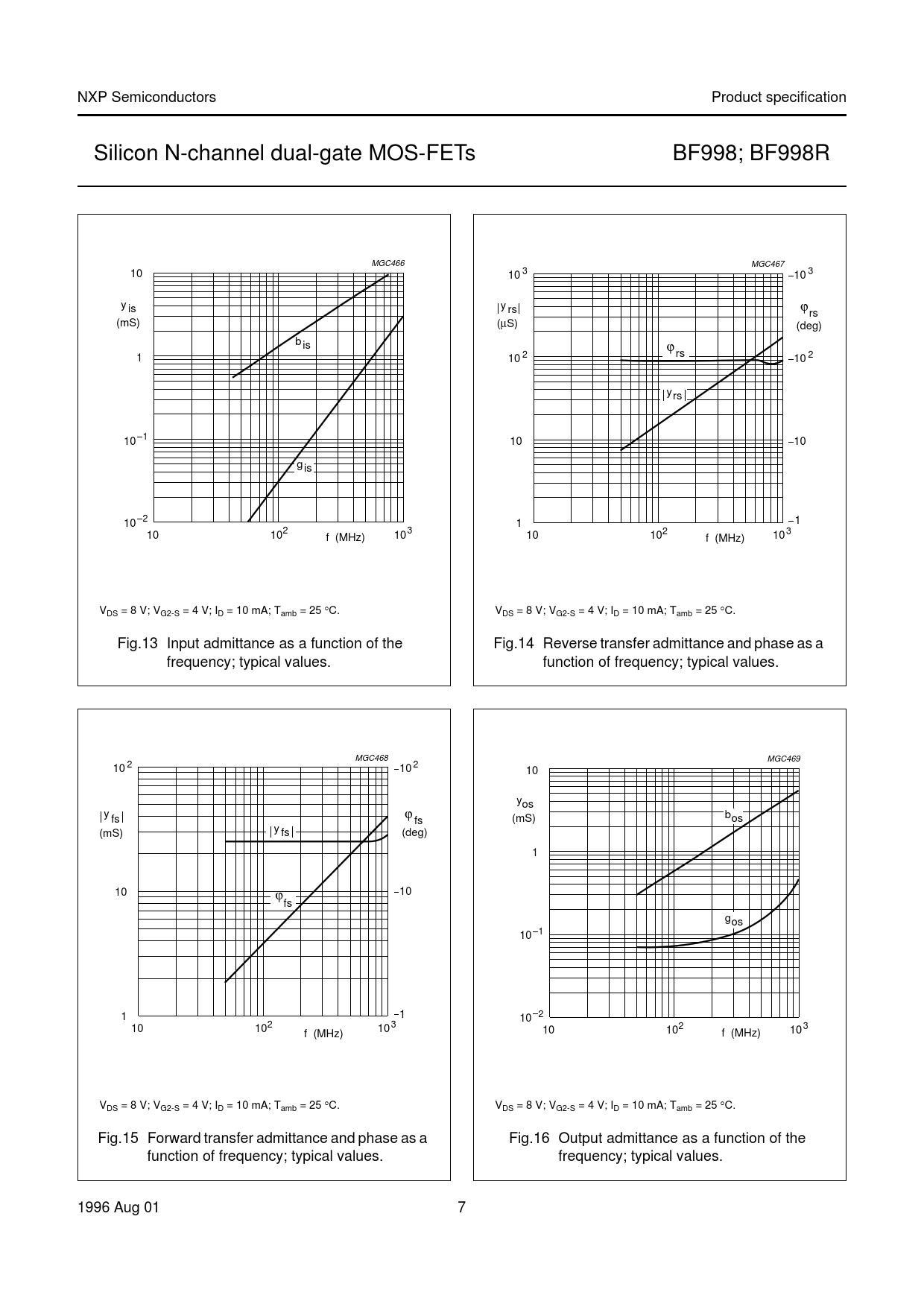 NXP. Semiconductors. Product. specification. Silicon. N-channel. dual-gate. MOS-FETs. BF998;. BF998R. MGC466. MGC467. 10. 10. 3. 10. 3. y. is. y. rs. ϕ. rs. (mS). (μS)