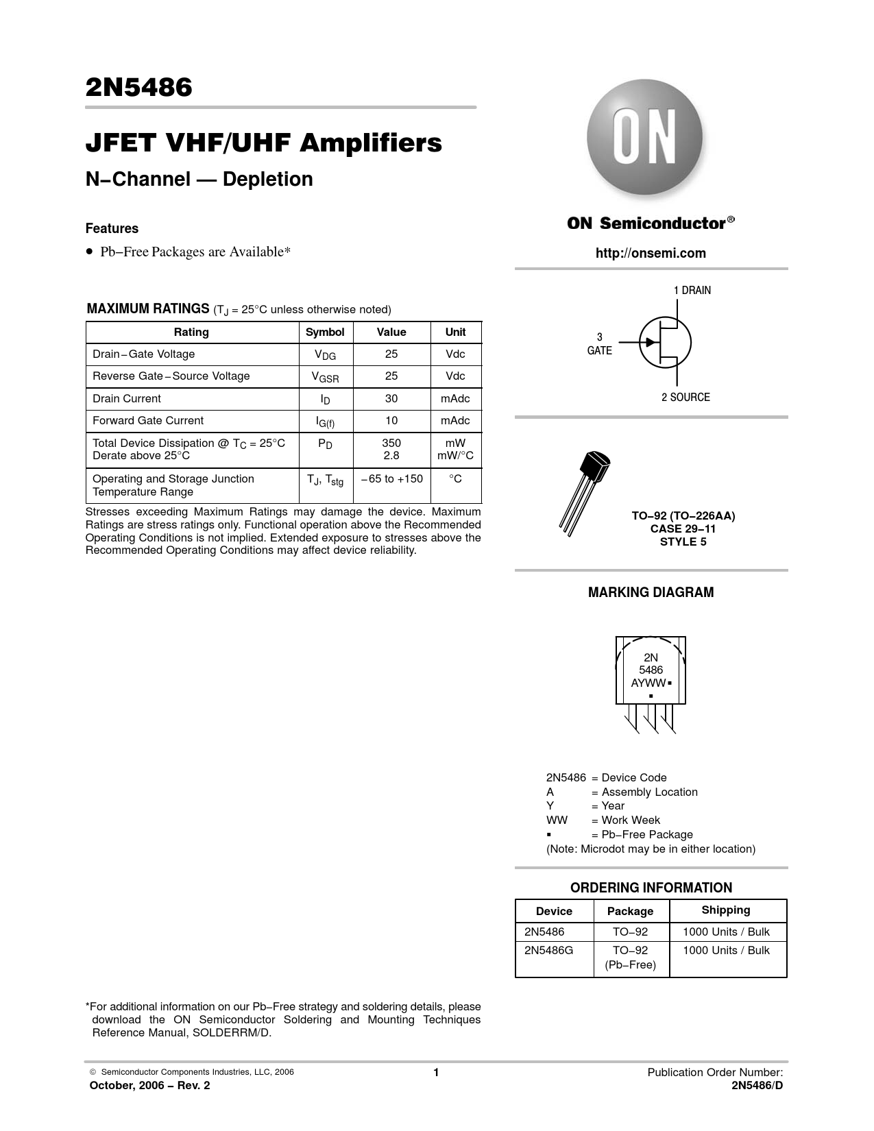 2N5486 TO−92 1000 Units / Bulk 2N5486G TO−92 1000 Units / Bulk (Pb−Free) *For additional information on our Pb−Free strategy and soldering details, please download the ON Semiconductor Soldering and Mounting Techniques Reference Manual, SOLDERRM/D. © Semiconductor Components Industries, LLC, 2006