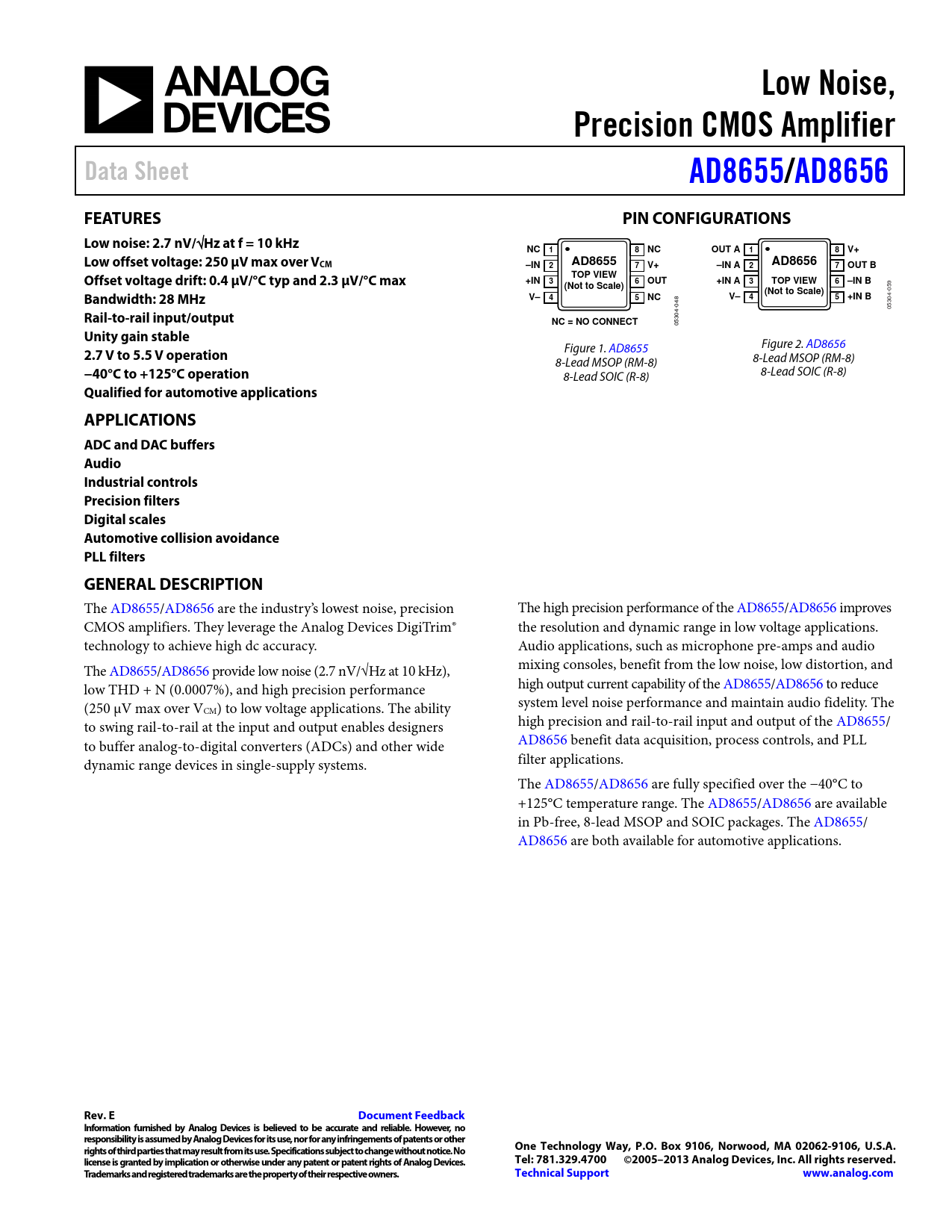 Low Noise,. Precision CMOS Amplifier. Data Sheet. AD8655/. AD8656. FEATURES. PIN CONFIGURATIONS. Low noise: 2.7 nV/. Hz at f = 10 kHz