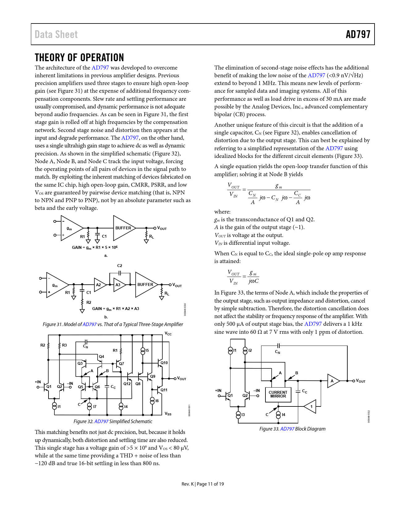 Data Sheet. AD797. THEORY OF OPERATION. BUFFER. VOUT. GAIN = gm × R1 × 5 × 106. GAIN = g. m × R1 × A2 × A3. Q10. +IN. –IN. OUT. Q12. Q11. CURRENT