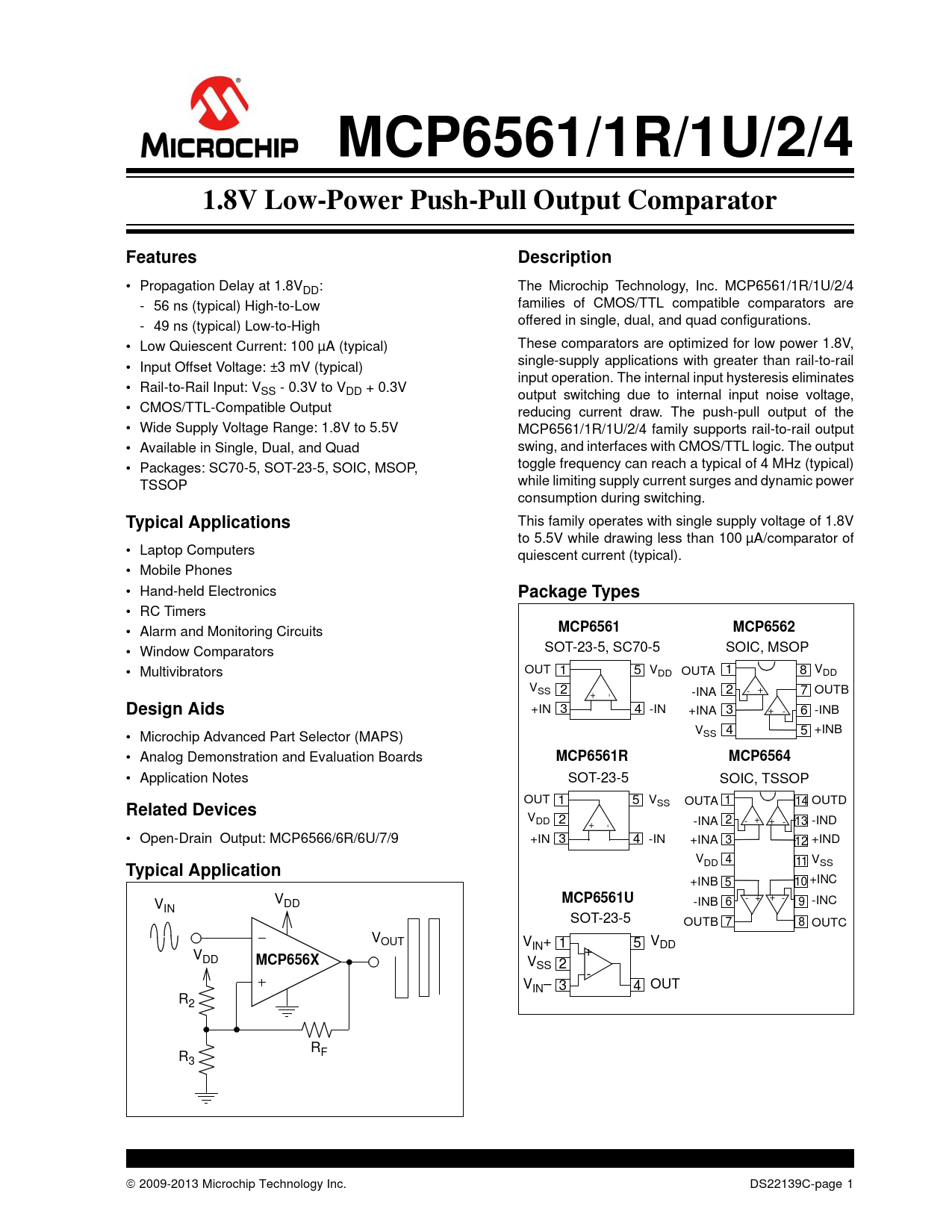 MCP6561/1R/1U/2/41.8V Low-Power Push-Pull Output ComparatorFeaturesDescription • Propagation Delay at 1.8VDD: The Microchip Technology, Inc. MCP6561/1R/1U/2/4 - 56 ns (typical) High-to-Low families of CMOS/TTL compatible comparators are - 49 ns (typical) Low-to-High offered in single, dual, and quad configurations. • Low Quiescent Current: 100 µA (typical) These comparators are optimized for low power 1.8V, • Input Offset Voltage: ±3 mV (typical) single-supply applications with greater than rail-to-rail input operation. The internal input hysteresis eliminates • Rail-to-Rail Input: VSS - 0.3V to VDD + 0.3V output switching due to internal input noise voltage, • CMOS/TTL-Compatible Output reducing current draw. The push-pull output of the • Wide Supply Voltage Range: 1.8V to 5.5V MCP6561/1R/1U/2/4 family supports rail-to-rail output • Available in Single, Dual, and Quad swing, and interfaces with CMOS/TTL logic. The output • Packages: SC70-5, SOT-23-5, SOIC, MSOP, toggle frequency can reach a typical of 4 MHz (typical) TSSOP while limiting supply current surges and dynamic power consumption during switching. Typical Applications This family operates with single supply voltage of 1.8V to 5.5V while drawing less than 100 µA/comparator of • Laptop Computers quiescent current (typical). • Mobile Phones • Hand-held Electronics Package Types • RC Timers • Alarm and Monitoring Circuits MCP6561MCP6562 • Window Comparators SOT-23-5, SC70-5 SOIC, MSOP • Multivibrators OUT 1 5 VDD OUTA 1 8 VDD VSS 2 + - -INA 2 - + 7 OUTB Design Aids +IN 3 4 -IN +INA 3 + - 6 -INB V 4 +INB • Microchip Advanced Part Selector (MAPS) SS 5 • Analog Demonstration and Evaluation Boards MCP6561RMCP6564 • Application Notes SOT-23-5 SOIC, TSSOP OUT 1 5 VSS OUTA 1 14 OUTD Related Devices VDD 2 + - -INA 2 - + + - 13 -IND • Open-Drain Output: MCP6566/6R/6U/7/9 +IN 3 4 -IN +INA 3 12 +IND V 4 V DD 11 SS Typical Application +INB 5 10 +INC - + - V VDD MCP6561U -INB 6 + 9 -INC IN SOT-23-5 OUTB 7 8 OUTC VOUT V V IN+ 1 + 5 DD VDD MCP656X VSS 2 - VIN– 3 4 OUT R2 RF R3 2009-2013 Microchip Technology Inc. DS22139C-page 1 Document Outline MCP6561/1R/1U/2/4 1.0 Electrical Characteristics 1.1 Maximum Ratings 1.2 Test Circuit Configuration FIGURE 1-1: AC and DC Test Circuit for the Push-Pull Output Comparators. 2.0 Typical Performance Curves FIGURE 2-1: Input Offset Voltage. FIGURE 2-2: Input Offset Voltage Drift. FIGURE 2-3: Input vs. Output Signal, No Phase Reversal. FIGURE 2-4: Input Hysteresis Voltage. FIGURE 2-5: Input Hysteresis Voltage Drift - Linear Temp. Co. (TC1). FIGURE 2-6: Input Hysteresis Voltage Drift - Quadratic Temp. Co. (TC2). FIGURE 2-7: Input Offset Voltage vs. Temperature. FIGURE 2-8: Input Offset Voltage vs. Common-mode Input Voltage. FIGURE 2-9: Input Offset Voltage vs. Common-mode Input Voltage. FIGURE 2-10: Input Hysteresis Voltage vs. Temperature. FIGURE 2-11: Input Hysteresis Voltage vs. Common-mode Input Voltage. FIGURE 2-12: Input Hysteresis Voltage vs. Common-mode Input Voltage. FIGURE 2-13: Input Offset Voltage vs. Supply Voltage vs. Temperature. FIGURE 2-14: Quiescent Current. FIGURE 2-15: Quiescent Current vs. Common-mode Input Voltage. FIGURE 2-16: Input Hysteresis Voltage vs. Supply Voltage vs. Temperature. FIGURE 2-17: Quiescent Current vs. Supply Voltage vs Temperature. FIGURE 2-18: Quiescent Current vs. Common-mode Input Voltage. FIGURE 2-19: Quiescent Current vs. Toggle Frequency. FIGURE 2-20: Output Headroom vs. Output Current. FIGURE 2-21: Low-to-High and High-to- Low Propagation Delays. FIGURE 2-22: Short Circuit Current vs. Supply Voltage vs. Temperature. FIGURE 2-23: Output Headroom vs.Output Current. FIGURE 2-24: Low-to-High and High-to- Low Propagation Delays . FIGURE 2-25: Propagation Delay Skew. FIGURE 2-26: Propagation Delay vs. Supply Voltage. FIGURE 2-27: Propagation Delay vs. Common-mode Input Voltage. FIGURE 2-28: Propagation Delay vs. Temperature. FIGURE 2-29: Propagation Delay vs. Input Over-Drive. FIGURE 2-30: Propagation Delay vs. Common-mode Input Voltage. FIGURE 2-31: Propagation Delay vs. Capacitive Load. FIGURE 2-32: Input Bias Current vs. Input Voltage vs Temperature. FIGURE 2-33: Common-mode Rejection Ratio and Power Supply Rejection Ratio vs. Temperature. FIGURE 2-34: Power Supply Rejection Ratio (PSRR). FIGURE 2-35: Common-mode Rejection Ratio (CMRR). FIGURE 2-36: Common-mode Rejection Ratio (CMRR). FIGURE 2-37: Output Jitter vs. Input Frequency. FIGURE 2-38: Input Offset Current and Input Bias Current vs. Temperature. FIGURE 2-39: Input Offset Current and Input Bias Current vs. Common-mode Input Voltage vs. Temperature. 3.0 Pin Descriptions TABLE 3-1: Pin Function Table 3.1 Analog Inputs 3.2 Digital Outputs 3.3 Power Supply (VSS and VDD) 4.0 Applications Information 4.1 Comparator Inputs 4.1.1 Normal Operation FIGURE 4-1: The MCP6561/1R/1U/2/4 Comparators’ Internal Hysteresis Eliminates Output Chatter Caused by Input Noise Voltage. 4.1.2 Input Voltage and Current Limits FIGURE 4-2: Simplified Analog Input ESD Structures. FIGURE 4-3: Protecting the Analog Inputs. 4.1.3 Phase Reversal 4.2 Push-Pull Output 4.3 Externally Set Hysteresis 4.3.1 Non-Inverting Circuit FIGURE 4-4: Non-inverting Circuit with Hysteresis for Single-Supply. FIGURE 4-5: Hysteresis Diagram for the Non-inverting Circuit. 4.3.2 Inverting Circuit FIGURE 4-6: Inverting Circuit With Hysteresis. FIGURE 4-7: Hysteresis Diagram for the Inverting Circuit. FIGURE 4-8: Thevenin Equivalent Circuit. 4.4 Bypass Capacitors 4.5 Capacitive Loads 4.6 PCB Surface Leakage FIGURE 4-9: Example Guard Ring Layout for Inverting Circuit. 4.7 PCB Layout Technique FIGURE 4-10: Recommended Layout. 4.8 Unused Comparators FIGURE 4-11: Unused Comparators. 4.9 Typical Applications 4.9.1 Precise Comparator FIGURE 4-12: Precise Inverting Comparator. 4.9.2 Windowed Comparator FIGURE 4-13: Windowed Comparator. 4.9.3 Bistable Multivibrator FIGURE 4-14: Bistable Multivibrator. 5.0 Design Aids 5.1 Microch