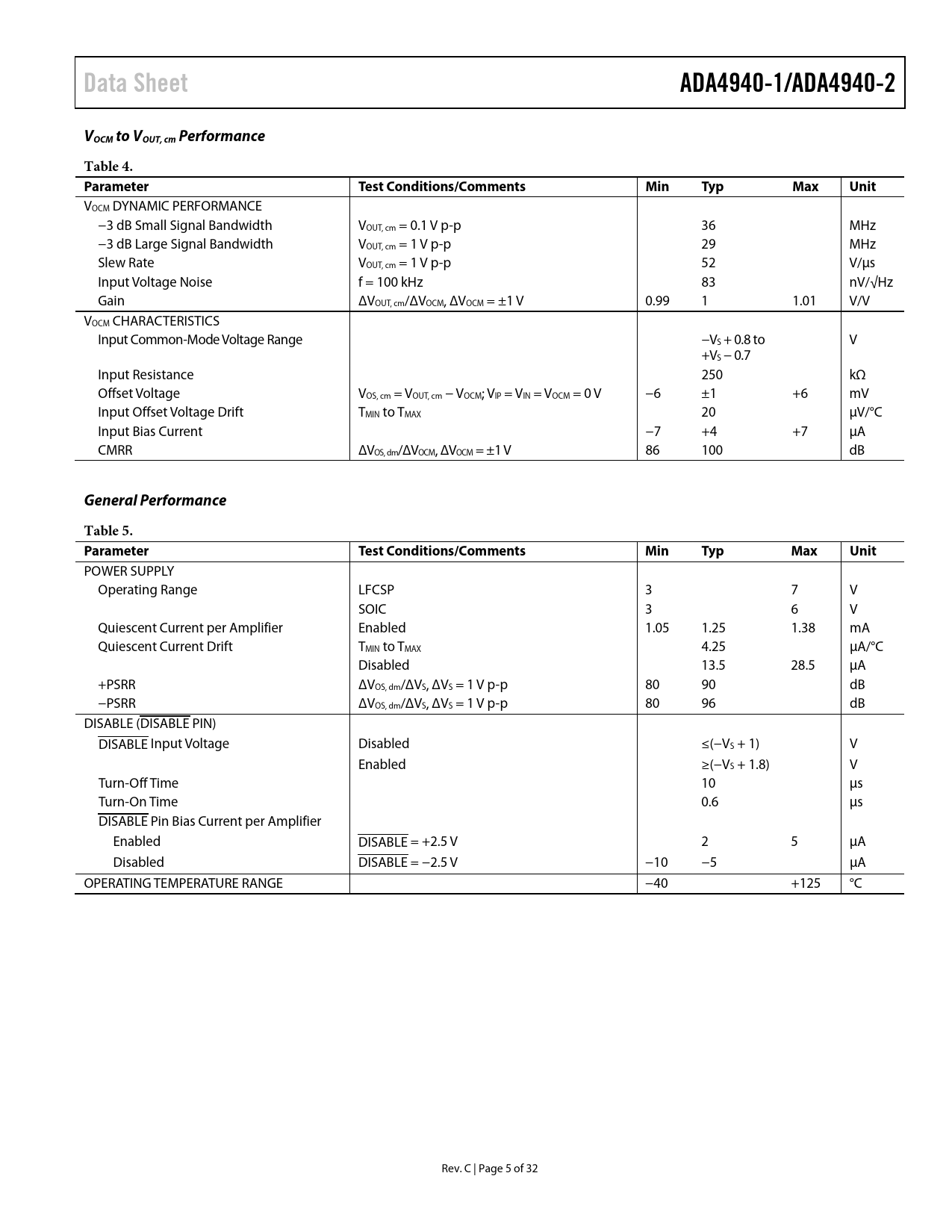 Data SheetADA4940-1/ADA4940-2VOCM to VOUT, cm PerformanceTable 4. ParameterTest Conditions/CommentsMinTypMaxUnit VOCM DYNAMIC PERFORMANCE −3 dB Small Signal Bandwidth VOUT, cm = 0.1 V p-p 36 MHz −3 dB Large Signal Bandwidth VOUT, cm = 1 V p-p 29 MHz Slew Rate VOUT, cm = 1 V p-p 52 V/µs Input Voltage Noise f = 100 kHz 83 nV/√Hz Gain ΔVOUT, cm/ΔVOCM, ΔVOCM = ±1 V 0.99 1 1.01 V/V VOCM CHARACTERISTICS Input Common-Mode Voltage Range −VS + 0.8 to V +VS − 0.7 Input Resistance 250 kΩ Offset Voltage VOS, cm = VOUT, cm − VOCM; VIP = VIN = VOCM = 0 V −6 ±1 +6 mV Input Offset Voltage Drift TMIN to TMAX 20 µV/°C Input Bias Current −7 +4 +7 µA CMRR ΔVOS, dm/ΔVOCM, ΔVOCM = ±1 V 86 100 dB General PerformanceTable 5. ParameterTest Conditions/CommentsMinTypMaxUnit POWER SUPPLY Operating Range LFCSP 3 7 V SOIC 3 6 V Quiescent Current per Amplifier Enabled 1.05 1.25 1.38 mA Quiescent Current Drift TMIN to TMAX 4.25 µA/°C Disabled 13.5 28.5 µA +PSRR ΔVOS, dm/ΔVS, ΔVS = 1 V p-p 80 90 dB −PSRR ΔVOS, dm/ΔVS, ΔVS = 1 V p-p 80 96 dB DISABLE (DISABLE PIN) DISABLE Input Voltage Disabled ≤(−VS + 1) V Enabled ≥(−VS + 1.8) V Turn-Off Time 10 µs Turn-On Time 0.6 µs DISABLE Pin Bias Current per Amplifier Enabled DISABLE = +2.5 V 2 5 µA Disabled DISABLE = −2.5 V −10 −5 µA OPERATING TEMPERATURE RANGE −40 +125 °C Rev. C | Page 5 of 32 Document Outline Features Applications General Description Functional Block Diagrams Revision History Specifications VS = 5 V +DIN or –DIN to VOUT, dm Performance VOCM to VOUT, cm Performance General Performance VS = 3 V +DIN or –DIN to VOUT, dm Performance VOCM to VOUT, cm Performance General Performance Absolute Maximum Ratings Thermal Resistance Maximum Power Dissipation ESD Caution Pin Configurations and Function Descriptions Typical Performance Characteristics Test Circuits Terminology Definition of Terms Differential Voltage Common-Mode Voltage (CMV) Common-Mode Offset Voltage Differential VOS, Differential CMRR, and VOCM CMRR Balance Theory of Operation Applications Information Analyzing an Application Circuit Setting the Closed-Loop Gain Estimating the Output Noise Voltage Impact of Mismatches in the Feedback Networks Calculating the Input Impedance of an Application Circuit Terminating a Single-Ended Input Input Common-Mode Voltage Range Input and Output Capacitive AC Coupling Setting the Output Common-Mode Voltage DISABLE Pin Driving a Capacitive Load Driving a High Precision ADC Layout, Grounding, and Bypassing ADA4940-1 LFCSP Example Outline Dimensions Ordering Guide