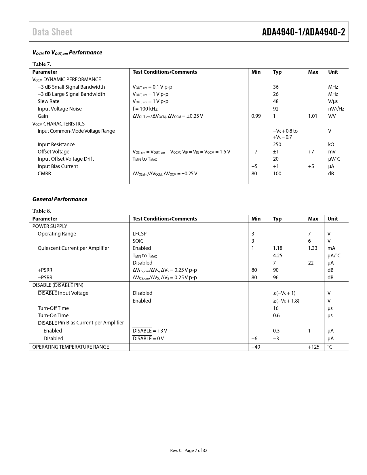 Data Sheet. ADA4940-1/ADA4940-2. VOCM to VOUT, cm Performance. Table 7. Parameter. Test Conditions/Comments. Min. Typ. Max. Unit