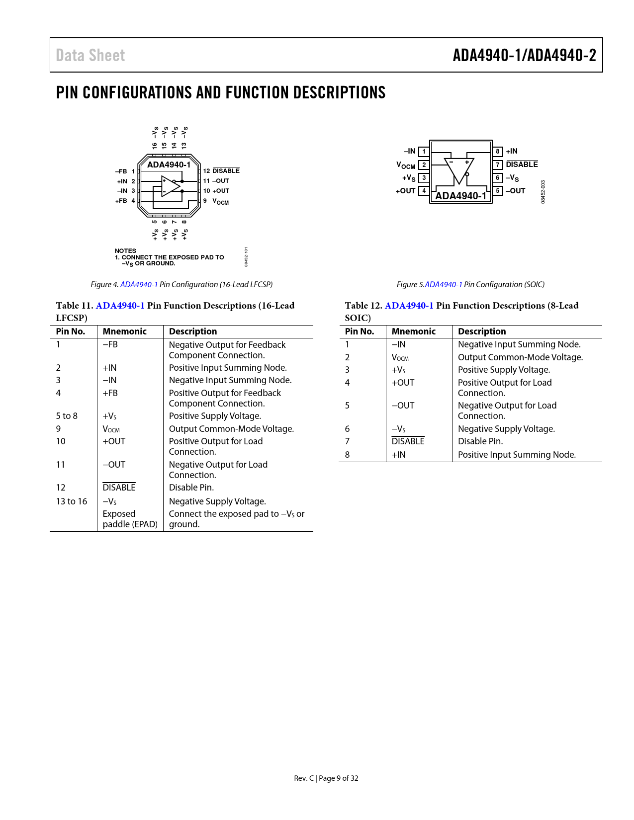 Data SheetADA4940-1/ADA4940-2PIN CONFIGURATIONS AND FUNCTION DESCRIPTIONSSSSSVVVV––––65431111–IN18+INADA4940-1VOCM 27DISABLE–FB 112 DISABLE+V6–V+IN 211 –OUTS3S 03 –IN 310 +OUT -0 +OUT45–OUTADA4940-1+FB 49VOCM 08452 5678SSSSVVVV++++ 01 NOTES 1 1. CONNECT THE EXPOSED PAD TO 452- –VS OR GROUND. 08 Figure 4. ADA4940-1 Pin Configuration (16-Lead LFCSP) Figure 5.ADA4940-1 Pin Configuration (SOIC) Table 11. ADA4940-1 Pin FunctionDescriptions (16-LeadTable 12. ADA4940-1 Pin Function Descriptions (8-LeadLFCSP)SOIC)Pin No.MnemonicDescriptionPin No.MnemonicDescription 1 −FB Negative Output for Feedback 1 −IN Negative Input Summing Node. Component Connection. 2 VOCM Output Common-Mode Voltage. 2 +IN Positive Input Summing Node. 3 +VS Positive Supply Voltage. 3 −IN Negative Input Summing Node. 4 +OUT Positive Output for Load 4 +FB Positive Output for Feedback Connection. Component Connection. 5 −OUT Negative Output for Load 5 to 8 +VS Positive Supply Voltage. Connection. 9 VOCM Output Common-Mode Voltage. 6 −VS Negative Supply Voltage. 10 +OUT Positive Output for Load 7 DISABLE Disable Pin. Connection. 8 +IN Positive Input Summing Node. 11 −OUT Negative Output for Load Connection. 12 DISABLE Disable Pin. 13 to 16 −VS Negative Supply Voltage. Exposed Connect the exposed pad to −VS or paddle (EPAD) ground. Rev. C | Page 9 of 32 Document Outline Features Applications General Description Functional Block Diagrams Revision History Specifications VS = 5 V +DIN or –DIN to VOUT, dm Performance VOCM to VOUT, cm Performance General Performance VS = 3 V +DIN or –DIN to VOUT, dm Performance VOCM to VOUT, cm Performance General Performance Absolute Maximum Ratings Thermal Resistance Maximum Power Dissipation ESD Caution Pin Configurations and Function Descriptions Typical Performance Characteristics Test Circuits Terminology Definition of Terms Differential Voltage Common-Mode Voltage (CMV) Common-Mode Offset Voltage Differential VOS, Differential CMRR, and VOCM CMRR Balance Theory of Operation Applications Information Analyzing an Application Circuit Setting the Closed-Loop Gain Estimating the Output Noise Voltage Impact of Mismatches in the Feedback Networks Calculating the Input Impedance of an Application Circuit Terminating a Single-Ended Input Input Common-Mode Voltage Range Input and Output Capacitive AC Coupling Setting the Output Common-Mode Voltage DISABLE Pin Driving a Capacitive Load Driving a High Precision ADC Layout, Grounding, and Bypassing ADA4940-1 LFCSP Example Outline Dimensions Ordering Guide