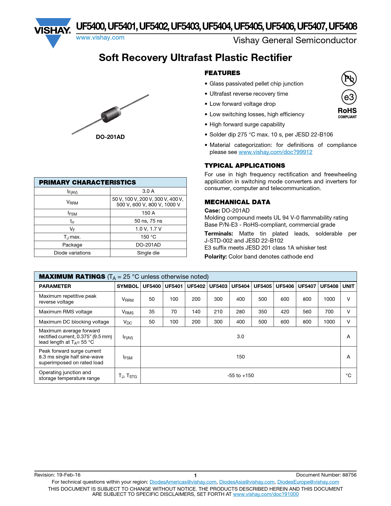 UF5400, UF5401, UF5402, UF5403, UF5404, UF5405, UF5406, UF5407, UF5408 www.vishay.com Vishay General Semiconductor Soft Recovery Ultrafast Plastic RectifierFEATURES • Glass passivated pellet chip junction • Ultrafast reverse recovery time • Low forward voltage drop • Low switching losses, high efficiency • High forward surge capability • Solder dip 275 °C max. 10 s, per JESD 22-B106 DO-201AD • Material categorization: for definitions of compliance please see www.vishay.com/doc?99912 TYPICAL APPLICATIONS For use in high frequency rectification and freewheeling application in switching mode converters and inverters for PRIMARY CHARACTERISTICS consumer, computer and telecommunication. IF(AV) 3.0 A 50 V, 100 V, 200 V, 300 V, 400 V, VRRM MECHANICAL DATA 500 V, 600 V, 800 V, 1000 V Case: DO-201AD IFSM 150 A Molding compound meets UL 94 V-0 flammability rating trr 50 ns, 75 ns Base P/N-E3 - RoHS-compliant, commercial grade VF 1.0 V, 1.7 V Terminals: Matte tin plated leads, solderable per TJ max. 150 °C J-STD-002 and JESD 22-B102 Package DO-201AD E3 suffix meets JESD 201 class 1A whisker test Diode variations Single die Polarity: Color band denotes cathode end MAXIMUM RATINGS (TA = 25 °C unless otherwise noted) PARAMETERSYMBOL UF5400 UF5401 UF5402 UF5403 UF5404 UF5405 UF5406 UF5407 UF5408 UNIT Maximum repetitive peak V reverse voltage RRM 50 100 200 300 400 500 600 800 1000 V Maximum RMS voltage VRMS 35 70 140 210 280 350 420 560 700 V Maximum DC blocking voltage VDC 50 100 200 300 400 500 600 800 1000 V Maximum average forward rectified current, 0.375" (9.5 mm) IF(AV) 3.0 A lead length at TA= 55 °C Peak forward surge current 8.3 ms single half sine-wave IFSM 150 A superimposed on rated load Operating junction and T storage temperature range J, TSTG -55 to +150 °C Revision: 19-Feb-16 1 Document Number: 88756 For technical questions within your region: DiodesAmericas@vishay.com, DiodesAsia@vishay.com, DiodesEurope@vishay.com THIS DOCUMENT IS SUBJECT TO CHANGE WITHOUT NOTICE. THE PRODUCTS DESCRIBED HEREIN AND THIS DOCUMENT ARE SUBJECT TO SPECIFIC DISCLAIMERS, SET FORTH AT www.vishay.com/doc?91000