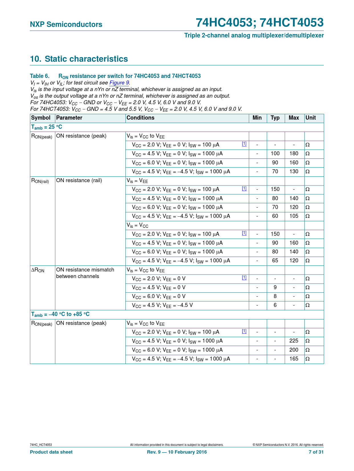 RON(peak) ON resistance (peak) Vis = VCC to VEE VCC = 2.0 V; VEE = 0 V; ISW = 100 A [1] - - - VCC = 4.5 V; VEE = 0 V; ISW = 1000 A - - 225 VCC = 6.0 V; VEE = 0 V; ISW = 1000 A - - 200 VCC = 4.5 V; VEE = 4.5 V; ISW = 1000 A - - 165 74HC_HCT4053 All information provided in this document is subject to legal disclaimers. © NXP Semiconductors N.V. 2016. All rights reserved.