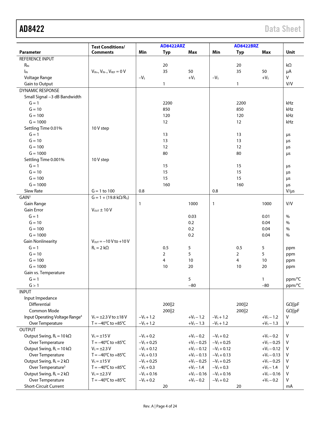 link to page 5 link to page 5 link to page 5 AD8422Data SheetTest Conditions/AD8422ARZAD8422BRZParameterCommentsMinTypMaxMinTypMaxUnit REFERENCE INPUT RIN 20 20 kΩ IIN VIN+, VIN−, VREF = 0 V 35 50 35 50 µA Voltage Range –VS +VS –VS +VS V Gain to Output 1 1 V/V DYNAMIC RESPONSE Small Signal −3 dB Bandwidth G = 1 2200 2200 kHz G = 10 850 850 kHz G = 100 120 120 kHz G = 1000 12 12 kHz Settling Time 0.01% 10 V step G = 1 13 13 µs G = 10 13 13 µs G = 100 12 12 µs G = 1000 80 80 µs Settling Time 0.001% 10 V step G = 1 15 15 µs G = 10 15 15 µs G = 100 15 15 µs G = 1000 160 160 µs Slew Rate G = 1 to 100 0.8 0.8 V/µs GAIN3 G = 1 + (19.8 kΩ/RG) Gain Range 1 1000 1 1000 V/V Gain Error VOUT ± 10 V G = 1 0.03 0.01 % G = 10 0.2 0.04 % G = 100 0.2 0.04 % G = 1000 0.2 0.04 % Gain Nonlinearity VOUT = −10 V to +10 V G = 1 RL = 2 kΩ 0.5 5 0.5 5 ppm G = 10 2 5 2 5 ppm G = 100 4 10 4 10 ppm G = 1000 10 20 10 20 ppm Gain vs. Temperature G = 1 5 1 ppm/°C G > 1 −80 –80 ppm/°C INPUT Input Impedance Differential 200||2 200||2 GΩ||pF Common Mode 200||2 200||2 GΩ||pF Input Operating Voltage Range4 VS = ±2.3 V to ±18 V −VS + 1.2 +VS − 1.2 –VS + 1.2 +VS − 1.2 V Over Temperature T = −40°C to +85°C −VS + 1.2 +VS − 1.3 –VS + 1.2 +VS − 1.3 V OUTPUT Output Swing, RL = 10 kΩ VS = ±15 V −VS + 0.2 +VS − 0.2 −VS + 0.2 +VS − 0.2 V Over Temperature T = −40°C to +85°C −VS + 0.25 +VS − 0.25 −VS + 0.25 +VS − 0.25 V Output Swing, RL = 10 kΩ VS = ±2.3 V −VS + 0.12 +VS − 0.12 −VS + 0.12 +VS − 0.12 V Over Temperature T = −40°C to +85°C −VS + 0.13 +VS − 0.13 −VS + 0.13 +VS − 0.13 V Output Swing, RL = 2 kΩ VS = ±15 V −VS + 0.25 +VS − 0.25 −VS + 0.25 +VS − 0.25 V Over Temperature5 T = −40°C to +85°C −VS + 0.3 +VS – 1.4 −VS + 0.3 +VS – 1.4 V Output Swing, RL = 2 kΩ VS = ±2.3 V −VS + 0.16 +VS − 0.16 −VS + 0.16 +VS − 0.16 V Over Temperature T = −40°C to +85°C −VS + 0.2 +VS − 0.2 −VS + 0.2 +VS − 0.2 V Short-Circuit Current 20 20 mA Rev. A | Page 4 of 24 Document Outline FEATURES APPLICATIONS CONNECTION DIAGRAM GENERAL DESCRIPTION TABLE OF CONTENTS REVISION HISTORY SPECIFICATIONS SOIC PACKAGE MSOP PACKAGE ABSOLUTE MAXIMUM RATINGS THERMAL RESISTANCE ESD CAUTION PIN CONFIGURATION AND FUNCTION DESCRIPTIONS TYPICAL PERFORMANCE CHARACTERISTICS THEORY OF OPERATION ARCHITECTURE GAIN SELECTION RG Power Dissipation REFERENCE TERMINAL INPUT VOLTAGE RANGE LAYOUT Common-Mode Rejection Ratio over Frequency Power Supplies and Grounding Reference Pin INPUT BIAS CURRENT RETURN PATH INPUT VOLTAGES BEYOND THE SUPPLY RAILS Input Voltages Beyond the Maximum Ratings RADIO FREQUENCY INTERFERENCE (RFI) APPLICATIONS INFORMATION PRECISION BRIDGE CONDITIONING PROCESS CONTROL ANALOG INPUT OUTLINE DIMENSIONS ORDERING GUIDE