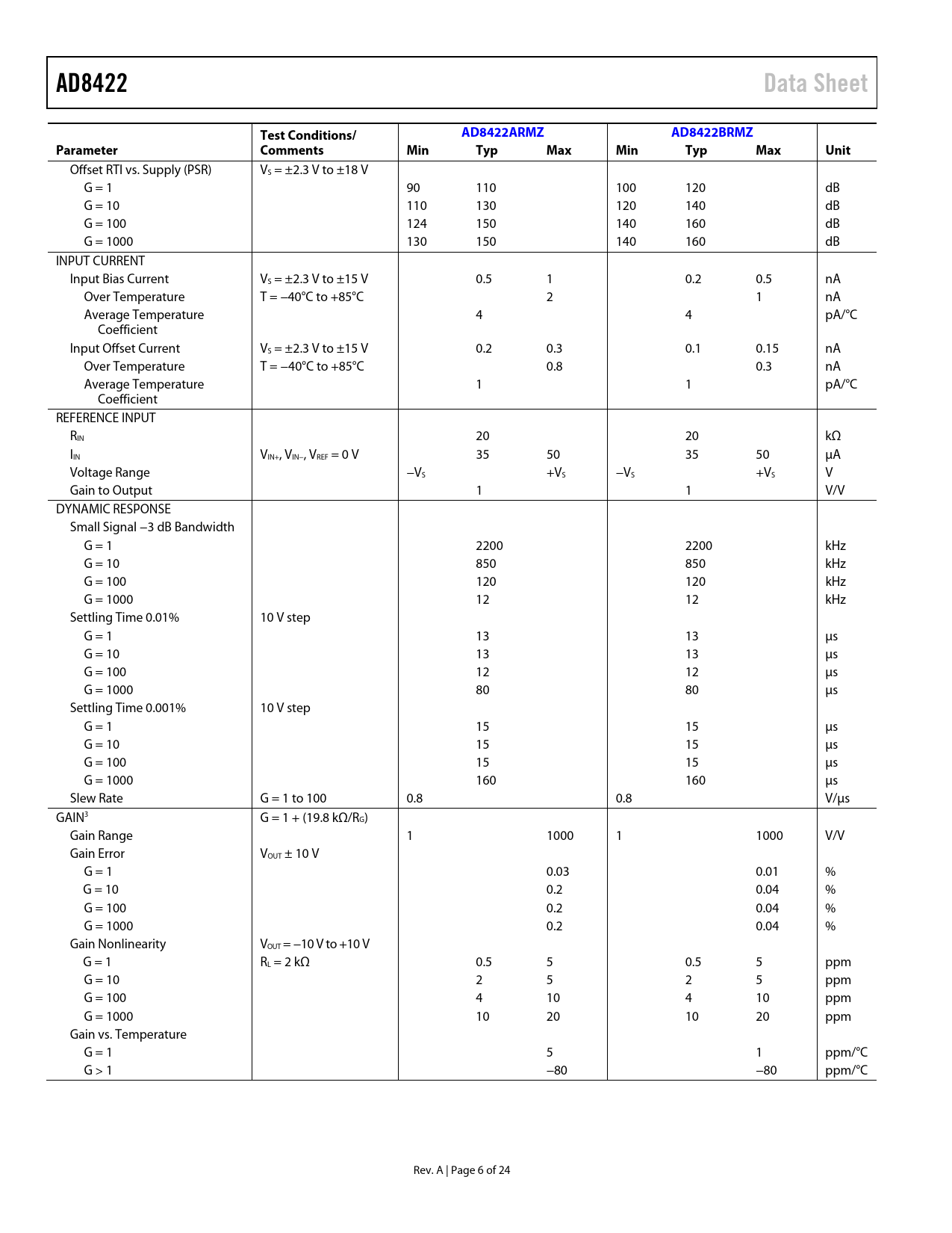 AD8422. Data Sheet. Test Conditions/. AD8422ARMZ. AD8422BRMZ. Parameter. Comments. Min. Typ. Max. Unit