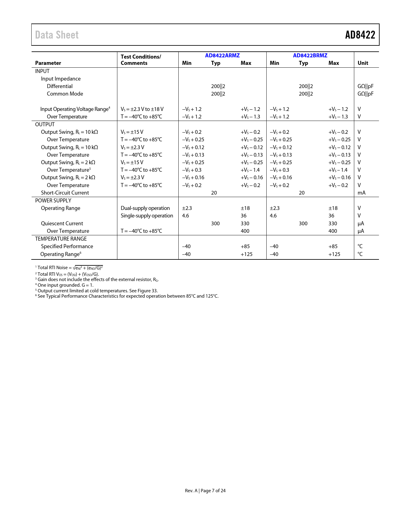 link to page 14 link to page 10 Data SheetAD8422Test Conditions/AD8422ARMZAD8422BRMZParameterCommentsMinTypMaxMinTypMaxUnit INPUT Input Impedance Differential 200||2 200||2 GΩ||pF Common Mode 200||2 200||2 GΩ||pF Input Operating Voltage Range4 VS = ±2.3 V to ±18 V −VS + 1.2 +VS − 1.2 −VS + 1.2 +VS − 1.2 V Over Temperature T = −40°C to +85°C −VS + 1.2 +VS − 1.3 −VS + 1.2 +VS − 1.3 V OUTPUT Output Swing, RL = 10 kΩ VS = ±15 V −VS + 0.2 +VS − 0.2 −VS + 0.2 +VS − 0.2 V Over Temperature T = −40°C to +85°C −VS + 0.25 +VS − 0.25 −VS + 0.25 +VS − 0.25 V Output Swing, RL = 10 kΩ VS = ±2.3 V −VS + 0.12 +VS − 0.12 −VS + 0.12 +VS − 0.12 V Over Temperature T = −40°C to +85°C −VS + 0.13 +VS − 0.13 −VS + 0.13 +VS − 0.13 V Output Swing, RL = 2 kΩ VS = ±15 V −VS + 0.25 +VS − 0.25 −VS + 0.25 +VS − 0.25 V Over Temperature5 T = −40°C to +85°C −VS + 0.3 +VS – 1.4 −VS + 0.3 +VS – 1.4 V Output Swing, RL = 2 kΩ VS = ±2.3 V −VS + 0.16 +VS − 0.16 −VS + 0.16 +VS − 0.16 V Over Temperature T = −40°C to +85°C −VS + 0.2 +VS − 0.2 −VS + 0.2 +VS − 0.2 V Short-Circuit Current 20 20 mA POWER SUPPLY Operating Range Dual-supply operation ±2.3 ±18 ±2.3 ±18 V Single-supply operation 4.6 36 4.6 36 V Quiescent Current 300 330 300 330 µA Over Temperature T = −40°C to +85°C 400 400 µA TEMPERATURE RANGE Specified Performance –40 +85 –40 +85 °C Operating Range6 –40 +125 –40 +125 °C 1 Total RTI Noise = √e 2 NI + (eNO/G)2 2 Total RTI VOS = (VOSI) + (VOSO/G). 3 Gain does not include the effects of the external resistor, RG. 4 One input grounded. G = 1. 5 Output current limited at cold temperatures. See Figure 33. 6 See Typical Performance Characteristics for expected operation between 85°C and 125°C. Rev. A | Page 7 of 24 Document Outline FEATURES APPLICATIONS CONNECTION DIAGRAM GENERAL DESCRIPTION TABLE OF CONTENTS REVISION HISTORY SPECIFICATIONS SOIC PACKAGE MSOP PACKAGE ABSOLUTE MAXIMUM RATINGS THERMAL RESISTANCE ESD CAUTION PIN CONFIGURATION AND FUNCTION DESCRIPTIONS TYPICAL PERFORMANCE CHARACTERISTICS THEORY OF OPERATION ARCHITECTURE GAIN SELECTION RG Power Dissipation REFERENCE TERMINAL INPUT VOLTAGE RANGE LAYOUT Common-Mode Rejection Ratio over Frequency Power Supplies and Grounding Reference Pin INPUT BIAS CURRENT RETURN PATH INPUT VOLTAGES BEYOND THE SUPPLY RAILS Input Voltages Beyond the Maximum Ratings RADIO FREQUENCY INTERFERENCE (RFI) APPLICATIONS INFORMATION PRECISION BRIDGE CONDITIONING PROCESS CONTROL ANALOG INPUT OUTLINE DIMENSIONS ORDERING GUIDE