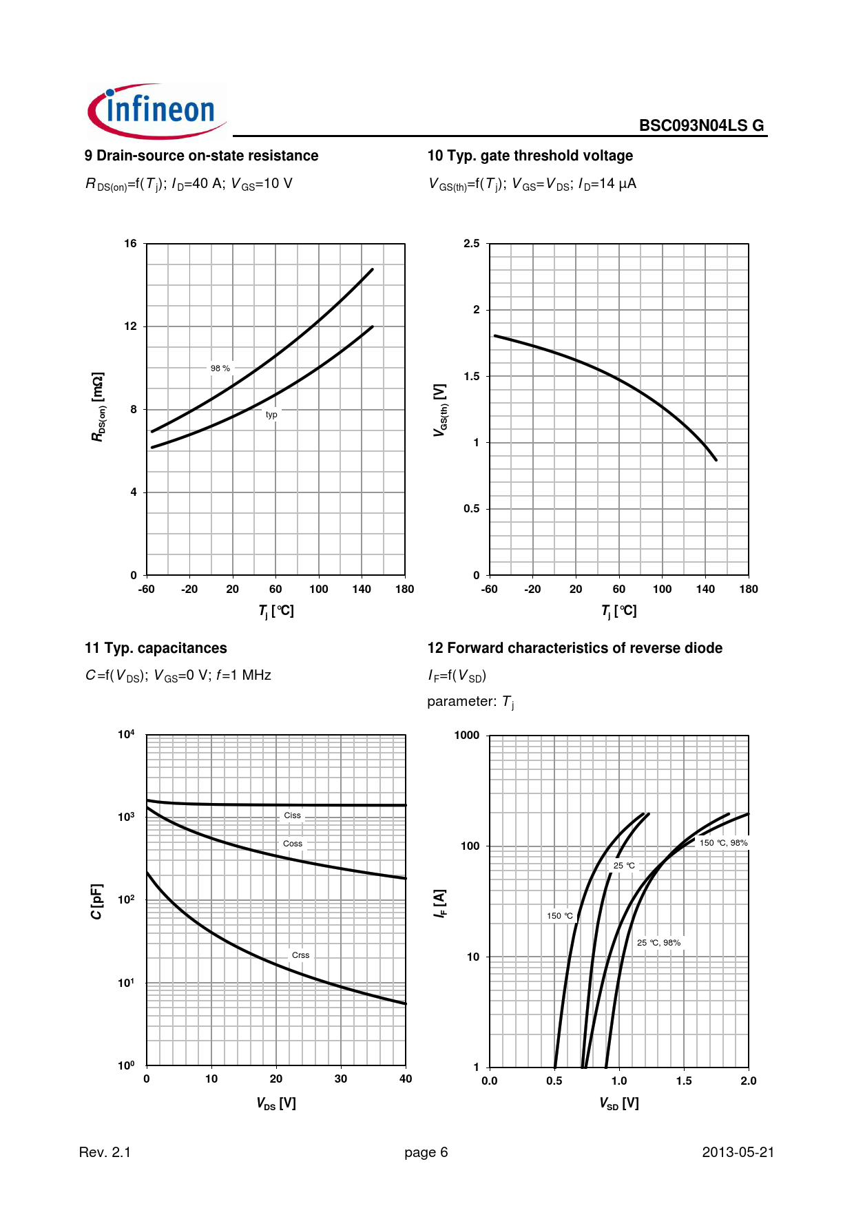 t o ( ( S DS G R V 1 4 0.5 0 0 -60 -20 20 60 100 140 180 -60 -20 20 60 100 140 180 T [°C] T [°C] j j 11 Typ. capacitances 12 Forward characteristics of reverse diode