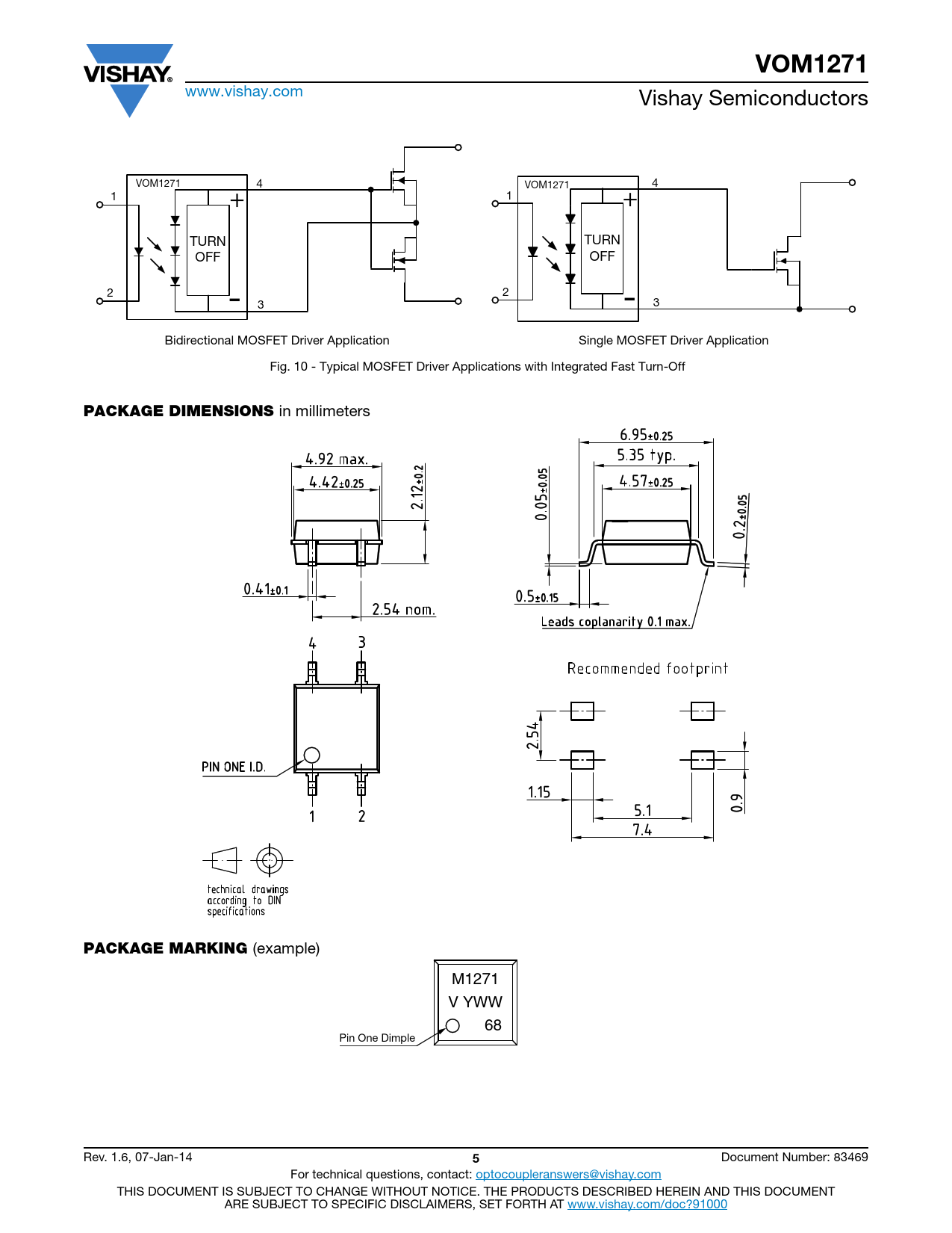 VOM1271 www.vishay.com Vishay Semiconductors VOM1271 4 VOM1271 4 1 + 1 + TURN TURN OFF OFF 2 - 2 - 3 3 Bidirectional MOSFET Driver Application Single MOSFET Driver Application Fig. 10 - Typical MOSFET Driver Applications with Integrated Fast Turn-Off PACKAGE DIMENSIONS in millimeters PACKAGE MARKING (example) M1271 V YWW 68 Pin One Dimple Rev. 1.6, 07-Jan-14 5 Document Number: 83469 For technical questions, contact: optocoupleranswers@vishay.com THIS DOCUMENT IS SUBJECT TO CHANGE WITHOUT NOTICE. THE PRODUCTS DESCRIBED HEREIN AND THIS DOCUMENT ARE SUBJECT TO SPECIFIC DISCLAIMERS, SET FORTH AT www.vishay.com/doc?91000