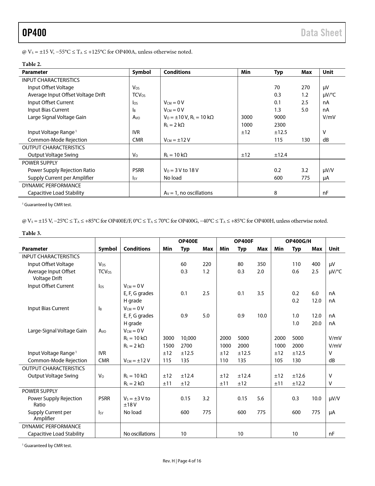 link to page 4 link to page 4 OP400Data Sheet @ VS = ±15 V, −55°C ≤ TA ≤ +125°C for OP400A, unless otherwise noted. Table 2. ParameterSymbolConditionsMinTypMaxUnit INPUT CHARACTERISTICS Input Offset Voltage VOS 70 270 µV Average Input Offset Voltage Drift TCVOS 0.3 1.2 µV/°C Input Offset Current IOS VCM = 0 V 0.1 2.5 nA Input Bias Current IB VCM = 0 V 1.3 5.0 nA Large Signal Voltage Gain AVO VO = ±10 V, RL = 10 kΩ 3000 9000 V/mV RL = 2 kΩ 1000 2300 Input Voltage Range1 IVR ±12 ±12.5 V Common-Mode Rejection CMR VCM = ±12 V 115 130 dB OUTPUT CHARACTERISTICS Output Voltage Swing VO RL = 10 kΩ ±12 ±12.4 POWER SUPPLY Power Supply Rejection Ratio PSRR VO = 3 V to 18 V 0.2 3.2 µV/V Supply Current per Amplifier ISY No load 600 775 µA DYNAMIC PERFORMANCE Capacitive Load Stability AV = 1, no oscillations 8 nF 1 Guaranteed by CMR test. @ VS = ±15 V, −25°C ≤ TA ≤ +85°C for OP400E/F, 0°C ≤ TA ≤ 70°C for OP400G, −40°C ≤ TA ≤ +85°C for OP400H, unless otherwise noted. Table 3.OP400EOP400FOP400G/HParameterSymbol ConditionsMinTypMax MinTypMax MinTypMax Unit INPUT CHARACTERISTICS Input Offset Voltage VOS 60 220 80 350 110 400 µV Average Input Offset TCVOS 0.3 1.2 0.3 2.0 0.6 2.5 µV/°C Voltage Drift Input Offset Current IOS VCM = 0 V E, F, G grades 0.1 2.5 0.1 3.5 0.2 6.0 nA H grade 0.2 12.0 nA Input Bias Current IB VCM = 0 V E, F, G grades 0.9 5.0 0.9 10.0 1.0 12.0 nA H grade 1.0 20.0 nA Large-Signal Voltage Gain AVO VCM = 0 V RL = 10 kΩ 3000 10,000 2000 5000 2000 5000 V/mV RL = 2 kΩ 1500 2700 1000 2000 1000 2000 V/mV Input Voltage Range1 IVR ±12 ±12.5 ±12 ±12.5 ±12 ±12.5 V Common-Mode Rejection CMR VCM = ±12 V 115 135 110 135 105 130 dB OUTPUT CHARACTERISTICS Output Voltage Swing VO RL = 10 kΩ ±12 ±12.4 ±12 ±12.4 ±12 ±12.6 V RL = 2 kΩ ±11 ±12 ±11 ±12 ±11 ±12.2 V POWER SUPPLY Power Supply Rejection PSRR VS = ±3 V to 0.15 3.2 0.15 5.6 0.3 10.0 µV/V Ratio ±18 V Supply Current per ISY No load 600 775 600 775 600 775 µA Amplifier DYNAMIC PERFORMANCE Capacitive Load Stability No oscil ations 10 10 10 nF 1 Guaranteed by CMR test. Rev. H | Page 4 of 16 Document Outline Features General Description Revision History Specifications Electrical Characteristics Absolute Maximum Ratings Thermal Resistance ESD Caution Typical Performance Characteristics Applications Dual Low Power Instrumentation Amplifier Bipolar Current Transmitter Differential Output Instrumentation Amplifier Multiple Output Tracking Voltage Reference Outline Dimensions Ordering Guide SMD Parts and Equivalents