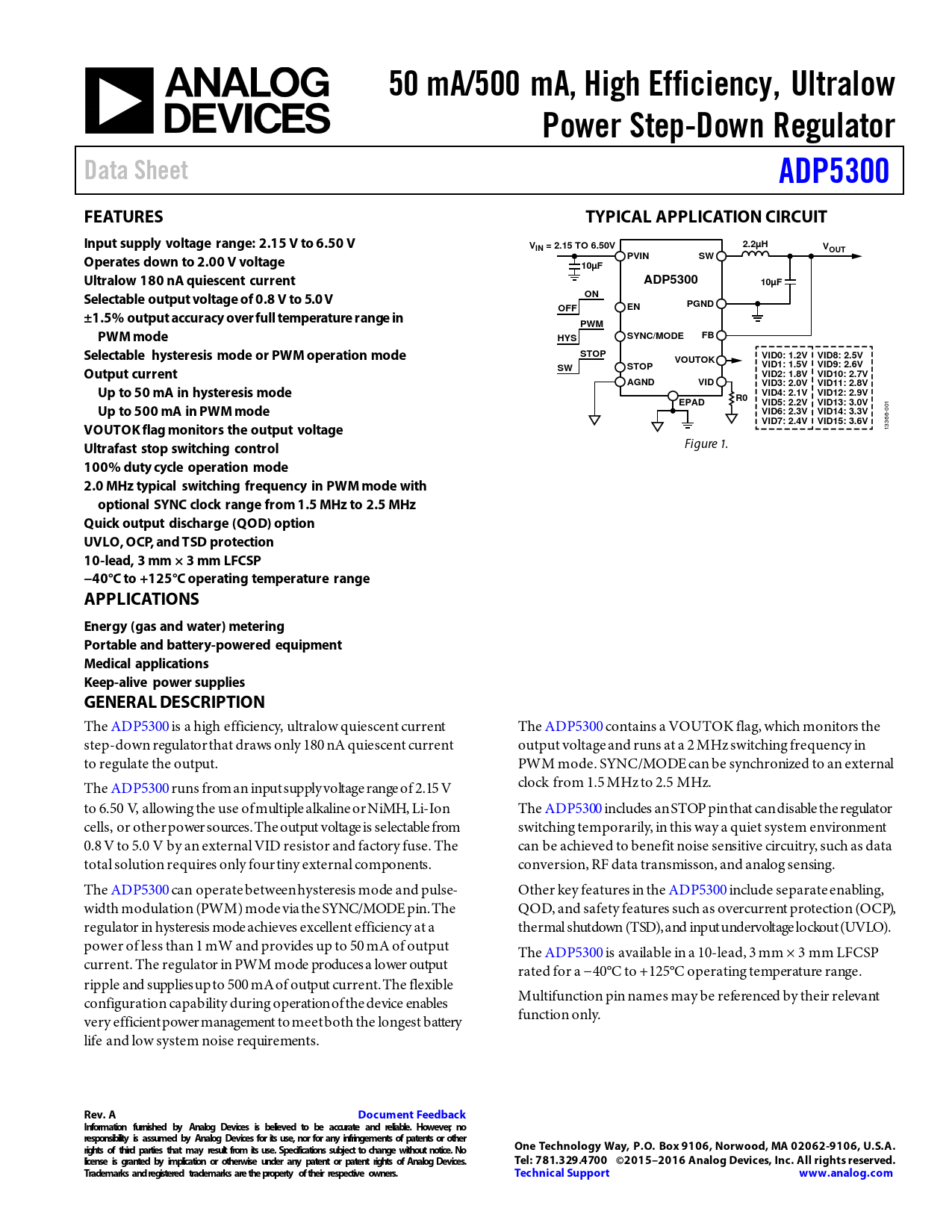 50 mA/500 mA, High Efficiency, Ultralow. Power Step-Down Regulator. Data Sheet. ADP5300. FEATURES. TYPICAL APPLICATION CIRCUIT