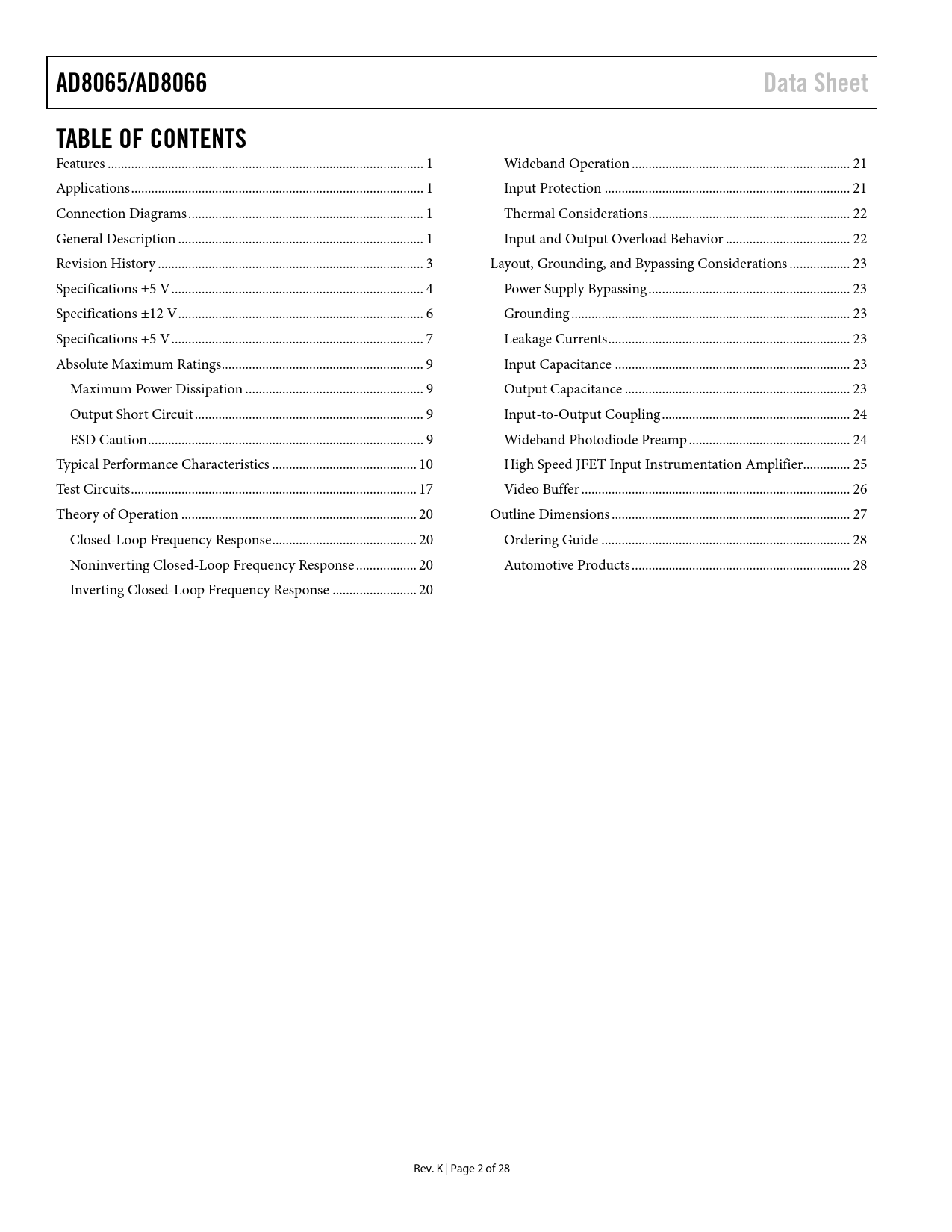 页数 / 页28 / 2 — AD8065/AD8066. Data Sheet. TABLE OF CONTENTS