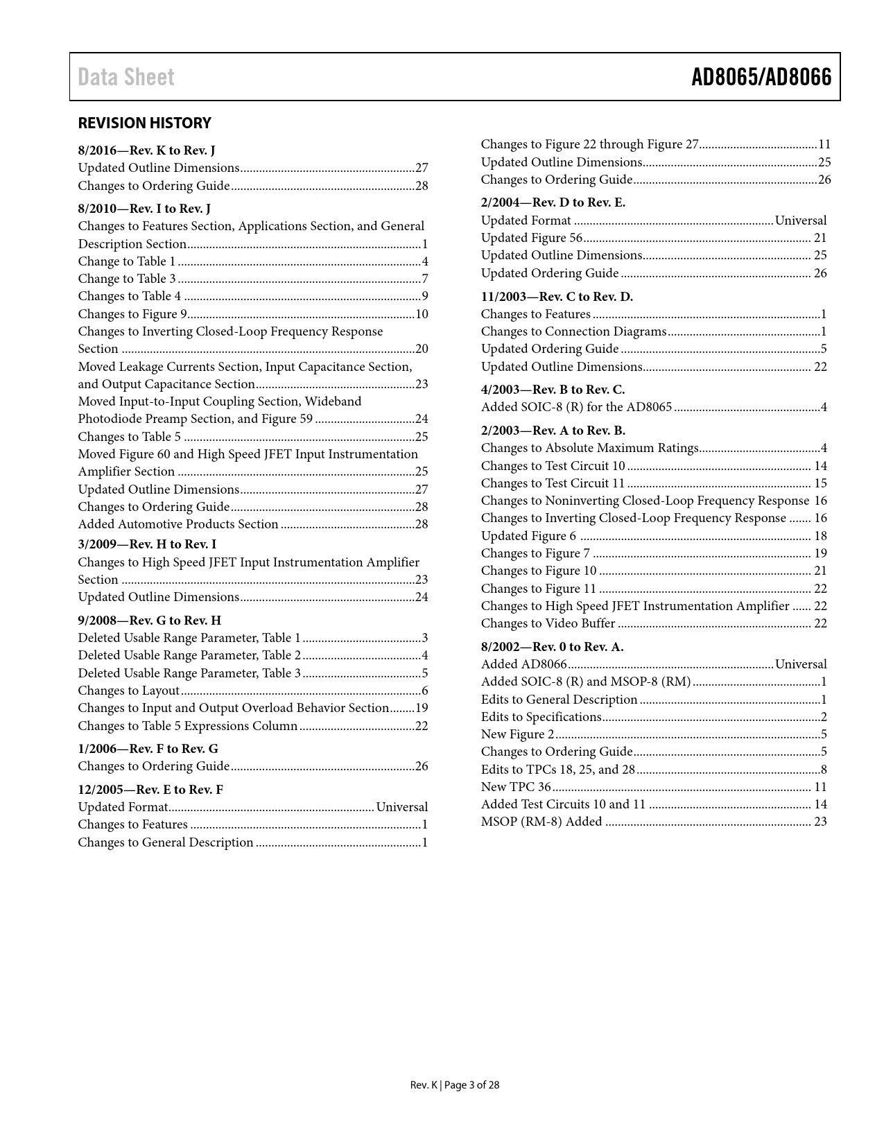 页数 / 页28 / 3 — Data Sheet. AD8065/AD8066. REVISION HISTORY. 8/2016—Rev. K to Rev. J. …